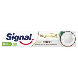 Offrez à vos dents une protection complète avec le dentifrice Signal Nature Elements Integral 8 Coco. La formule douce de ce dentifrice au Zinc Minéral aide à lutter efficacement contre les bactéries et à retrouver des dents plus blanches. Le dentifrice combine 8 actions : protection contre les caries, renforcement des gencives et de l'émail, haleine fraîche, aide pour retrouver la blancheur naturelle des dents, anti-plaque, anti-tartre et antibactérien. Résultat : une protection complète inspirée de la nature, pour toute la famille. Le tube et le carton du dentifrice Signal Nature Elements Coco sont entièrement recyclables – déposez-les dans votre bac de tri. Chez Signal, nous pensons que votre sourire est l'expression de votre personnalité et de votre confiance en vous. Notre mission : améliorer l'hygiène bucco-dentaire de tous grâce à nos brosse à dents et dentifrices, pour que chacun d'entre nous libère le pouvoir de son sourire. Signal accompagne les Français depuis 1961 pour leur transmettre les bons gestes, dès le plus jeune âge, et démontrer l'importance d'un brossage deux fois par jour, matin et soir pour des dents blanches et saines. Nous prenons des mesures pour limiter l'impact environnemental de nos produits. C'est pourquoi nos tubes de dentifrice Signal Integral 8 Nature Elements sont désormais recyclables dans la filière classique. Avec Signal, chaque sourire compte !