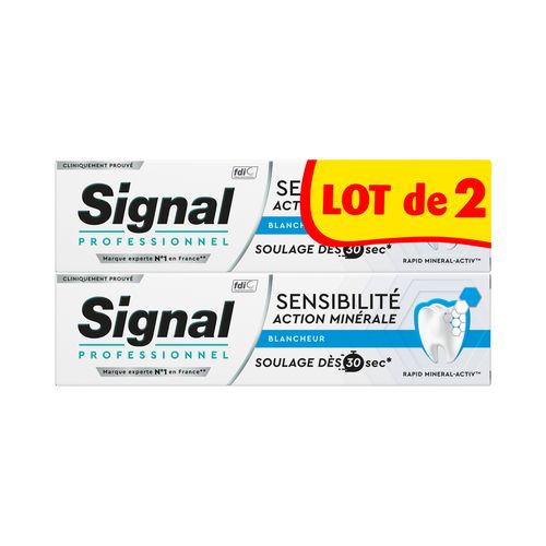 Le dentifrice Signal Professionnel Sensibilité Prévention Minérale Blancheur rend les dents 4 x plus fortes* et les gencives saines. Sa formule scientifiquement prouvée, résultat de 10 ans de recherche par les laboratoires Signal, et développée par une équipe d'experts dentaires et scientifiques, utilise le pouvoir des minéraux pour prévenir la sensibilité dentaire avant qu'elle ne survienne. La sensibilité survient quand l'émail, la couche minérale protectrice de la dent, est endommagée et/ou lorsque les gencives de rétractent. Grâce à sa technologie Mineral Protect™, ce dentifrice Signal Professionnel renforce et protège l'émail, et prévient la sensibilité dentaire. Le minéral HAP renforce l'émail et aide à prévenir sa perte, avec le même minéral dont il est naturellement constitué. Le fluor renforce les dents au quotidien. Le zinc minéral, quant à lui, participe à prévenir les inflammations gingivales occasionnelles. Avec 88 % d'ingrédients d'origine naturelle et enrichie en vitamine E aux propriétés antioxydantes. La formule du dentifrice Signal Professionnel Sensibilité Prévention Minérale Blancheur aide à maintenir des gencives saines. Chez Signal, nous pensons que votre sourire est l'expression de votre personnalité et de votre confiance en vous. Notre mission : maintenir la bonne santé bucco-dentaire de tous, pour que chacun d'entre nous libère le pouvoir de son sourire. Signal accompagne les Français depuis 1961 pour leur transmettre les bons gestes dès le plus jeune âge et démontrer l'importance d'un brossage deux fois par jour, matin et soir, et de changer régulièrement de brosse à dents. Attentifs à l'environnement, nous prenons des mesures pour limiter l'impact environnemental de nos produits. Avec Signal, chaque sourire compte ! *Étude in vitro, augmentation de 4 fois la microdureté de l'émail après 7 jours d'utilisation du produit comparé à la première utilisation.