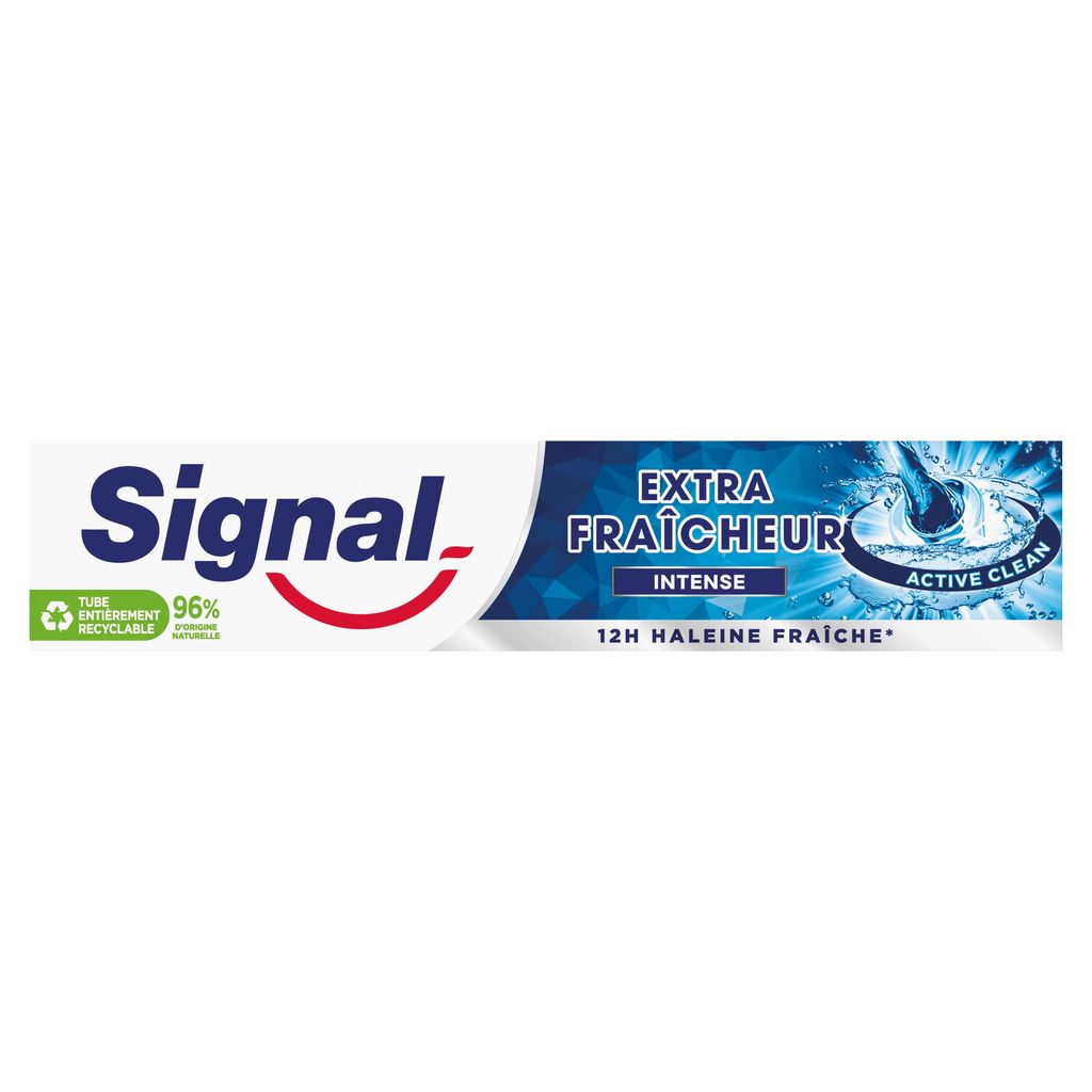 Le dentifrice Signal Extra Fraîcheur Intense vous procure une haleine fraîche extra longue durée jusqu'à 12h*. Sa formule contient du zinc minéral efficace contre les bactéries responsables de la mauvaise haleine et du fluor pour rendre les dents plus fortes. Elle est encore plus efficace** grâce à sa technologie Zinc. De plus, le tube de ce dentifrice Signal Extra Fraîcheur Intense est entièrement recyclable. Pour une bonne santé bucco-dentaire, Signal recommande un brossage deux fois par jour, une brosse à dents neuve tous les trois mois et une visite chez le dentiste deux fois par an. Découvrez aussi notre dentifrice de la même gamme Extra Fraîcheur Blancheur. Chez Signal, nous pensons que votre sourire est l'expression de votre personnalité et de votre confiance en vous. Notre mission : améliorer la santé bucco-dentaire de tous, pour que chacun d'entre nous libère le pouvoir de son sourire. Signal accompagne les Français depuis 1961 pour leur transmettre les bons gestes, dès le plus jeune âge et démontrer l'importance d'un brossage deux fois par jour, matin et soir. Nous prenons des mesures pour limiter l'impact environnemental de nos produits. Avec Signal, chaque sourire compte ! *Test clinique réalisé sur 405 personnes après 4 semaines d'utilisation. **Comparé à l'ancienne formule.