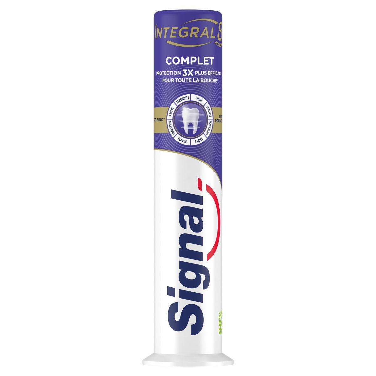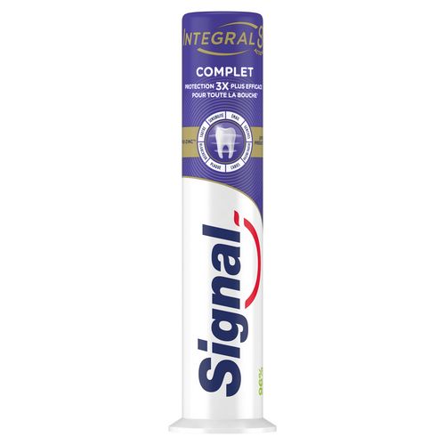 Pour une bouche intégralement protégée et en bonne santé jour après jour, choisissez Signal Integral 8 Complet. Dotée d'un effet prébiotique, sa technologie PRO-ZINC™ renforce les défenses naturelles de votre bouche en augmentant les bonnes bactéries et en réduisant les mauvaises. Sa nouvelle formule permet une action antibactérienne de 24 h et une protection complète 3 x plus efficace¹ : des dents, gencives, joues et langue saines. Composée de 96 % d'ingrédients d'origine naturelle, elle convient à toute la famille. Ce dentifrice Integral 8 offre 8 actions : protection caries, protection gencives, émail renforcé, action blancheur, haleine fraîche, anti-plaque, anti-tartre et sensibilité. Son format plus grand distribue directement la bonne dose de dentifrice sur votre brosse à dent. Pour une bonne hygiène bucco-dentaire de toute la famille, suivez ces étapes simples : (1) le matin, brossez-vous les dents avec le dentifrice et la brosse à dents Signal, et rincez-vous la bouche avec le bain de bouche Signal. (2) Pendant la journée, rafraîchissez votre haleine avec le bain de bouche Signal. (3) Le soir, brossez-vous les dents avec la brosse à dents et le dentifrice Signal et rincez-vous avec le bain de bouche Signal. Pensez à changer votre brosse à dents tous les trois mois et vous rendre régulièrement chez le dentiste. ¹Étude in vivo mesurant la réduction des bactéries sur les dents, les gencives, les joues et la langue comparée à un dentifrice fluoré classique, après 28 jours avec un brossage deux fois par jour.