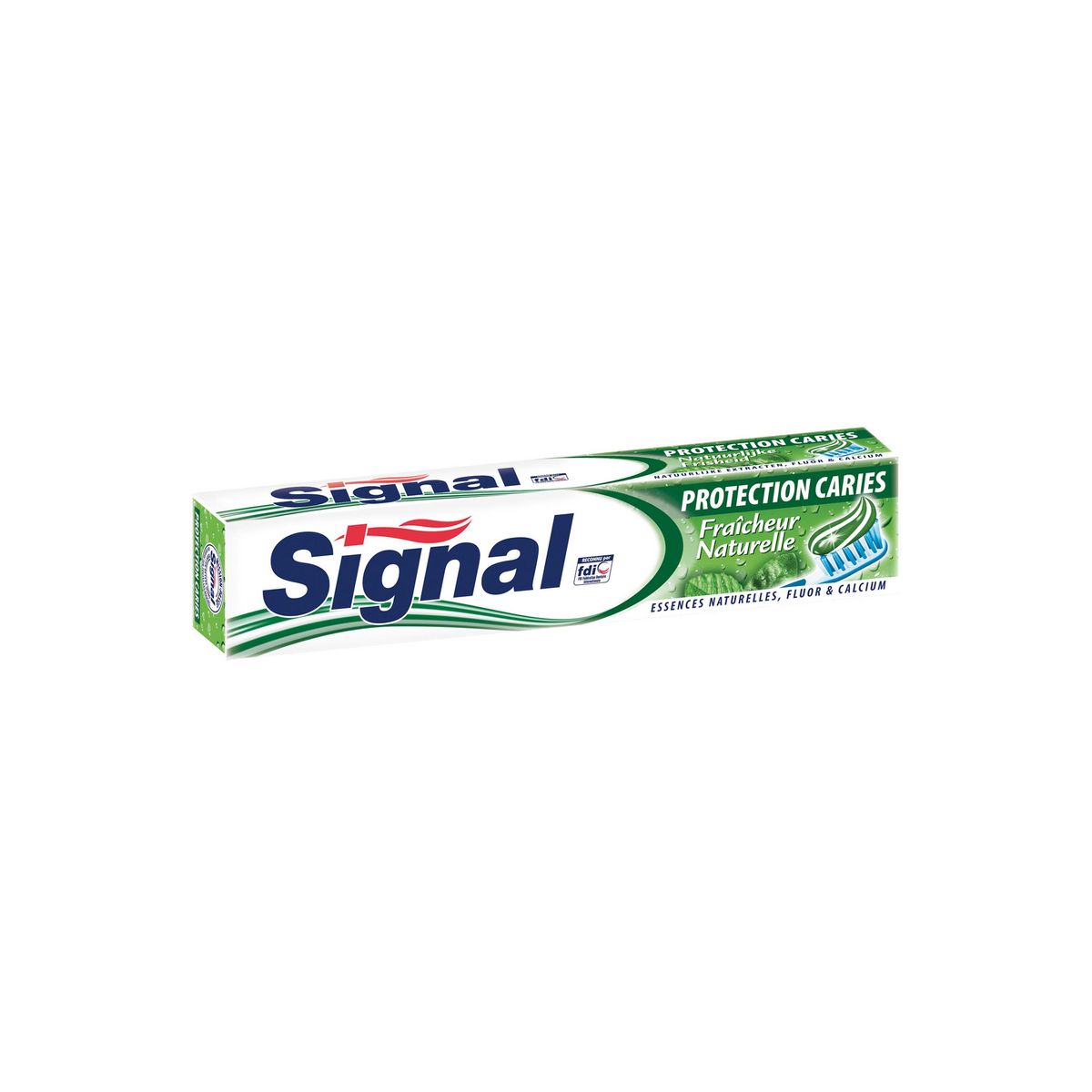 Le dentifrice Signal Protection Caries Fraîcheur Naturelle offre à vos dents une double action. Sa formule enrichie en fluor et en calcium vous aide à lutter contre les caries et à garder des dents fortes tout en respectant l'émail. De plus, grâce à un mélange d’essences naturelles à base de menthe sauvage, de sauge, de myrrhe et d'eucalyptus, connues pour leurs propriétés rafraîchissantes, il combat la mauvaise haleine et laisse dans votre bouche une sensation de fraîcheur longue durée. La FDI reconnaît qu'un brossage deux fois par jour avec un dentifrice fluoré comme Protection Caries Fraîcheur Naturelle contribue à maintenir une bonne hygiène bucco-dentaire. N'oubliez pas de couper l'eau pendant le brossage.
