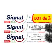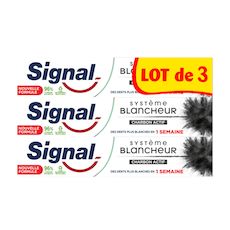 Le dentifrice Signal Système Blancheur Charbon vous procure un sourire plus éclatant et une blancheur naturelle en une semaine*. À 95 % d'ingrédients d'origine naturelle, sa nouvelle formule est infusée au charbon actif pour révéler la blancheur naturelle de vos dents et renforcer votre émail. Elle contient également un minéral blancheur d'origine naturelle qui nettoie les dents, et est enrichie en fluor pour des plus fortes, jour après jour. De plus, le tube de ce dentifrice blancheur est entièrement recyclable et fabriqué avec 25 % de plastique recyclé. Pour une bonne santé bucco-dentaire, Signal recommande un brossage deux fois par jour, une brosse à dents neuve tous les trois mois et une visite chez le dentiste deux fois par an. Chez Signal, nous pensons que votre sourire est l'expression de votre personnalité et de votre confiance en vous. Notre mission : améliorer la santé bucco-dentaire de tous, pour que chacun d'entre nous libère le pouvoir de son sourire. Signal accompagne les Français depuis 1961 pour leur transmettre les bons gestes, dès le plus jeune âge et démontrer l'importance d'un brossage deux fois par jour, matin et soir. Nous prenons des mesures pour limiter l'impact environnemental de nos produits. Avec Signal, chaque sourire compte ! *Test clinique d'élimination des taches réalisé sur 55 personnes avec une brossage deux fois par jour.