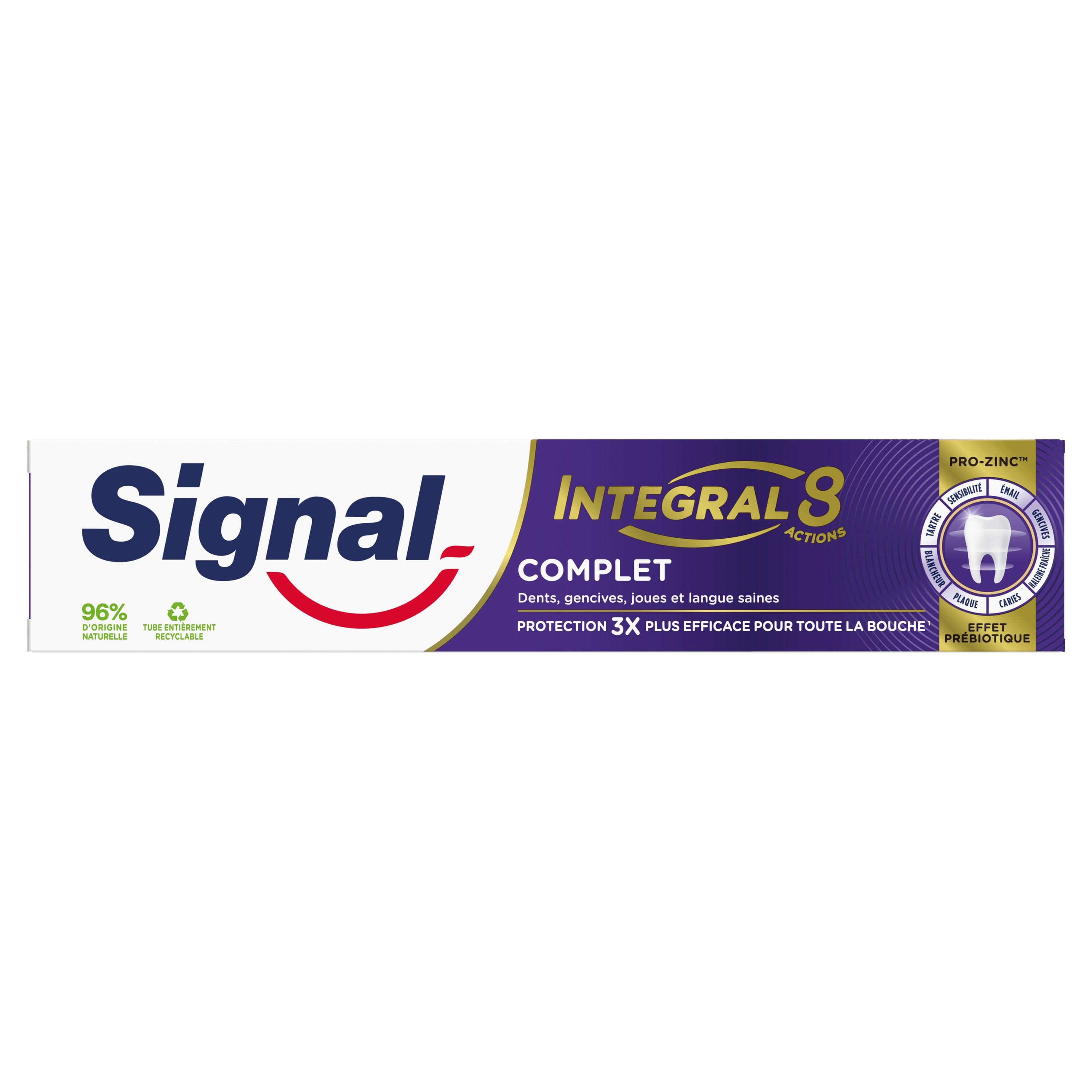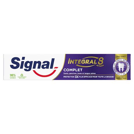 Pour une bouche intégralement protégée et en bonne santé jour après jour, choisissez Signal Integral 8 Complet. Dotée d'un effet prébiotique, sa technologie PRO-ZINC™ renforce les défenses naturelles de votre bouche en augmentant les bonnes bactéries et en réduisant les mauvaises. Sa formule permet une action antibactérienne de 24 h et une protection complète 3 x plus efficace¹ : des dents, gencives, joues et langue saines. Composée de 96 % d'ingrédients d'origine naturelle, elle convient à toute la famille. Ce dentifrice Integral 8 offre 8 actions : protection caries, protection gencives, émail renforcé, action blancheur, haleine fraîche, anti-plaque, anti-tartre et sensibilité. De plus, son tube est entièrement recyclable. Pour une bonne hygiène bucco-dentaire de toute la famille, suivez ces étapes simples : (1) le matin, brossez-vous les dents avec le dentifrice et la brosse à dents Signal, et rincez-vous la bouche avec le bain de bouche Signal. (2) Pendant la journée, rafraîchissez votre haleine avec le bain de bouche Signal. (3) Le soir, brossez-vous les dents avec la brosse à dents et le dentifrice Signal et rincez-vous avec le bain de bouche Signal. Pensez à changer votre brosse à dents tous les 3 mois et vous rendre régulièrement chez le dentiste. ¹Étude in vivo mesurant la réduction des bactéries sur les dents, les gencives, les joues et la langue comparée à un dentifrice fluoré classique, après 28 jours avec un brossage deux fois par jour.