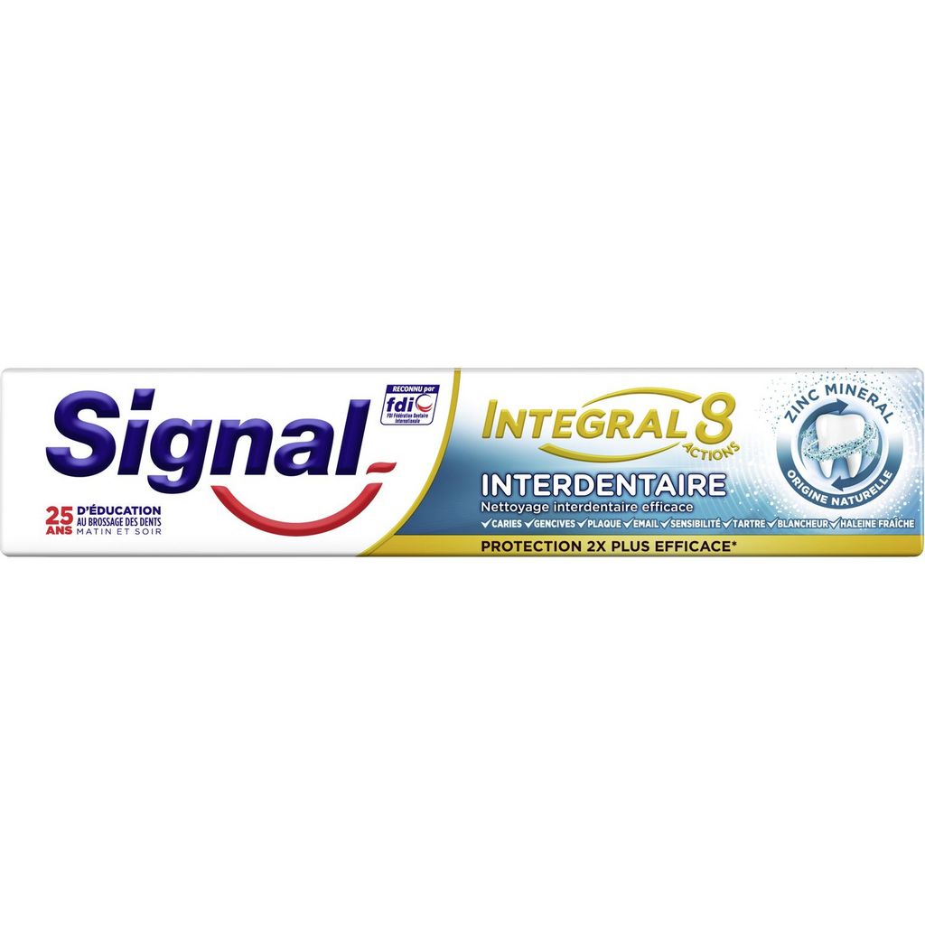 Dentifrice Antibactérien La formule aux microparticules de Signal Dentifrice Integral 8 Interdentaire permet d’éliminer la plaque dentaire dans les zones difficiles d’accès, même entre les dents. Contient une formule antibactérienne au Pro-Time Zinc pour une action contre la plaque dentaire qui dure 18 heures. Une formule complète qui vous aide à protéger vos dents entre chaque brossage*. Le résultat : une protection longue durée et 8 actions efficaces. 1.Aider à protéger contre les caries 2.Renforcer les gencives 3.Offrir un effet anti-plaque jusqu’à 18 heures 4.Renforcer l’émail 5.Aider à retrouver la blancheur naturelle des dents 6.Rafraîchir l’haleine 7.Combattre la formation du tartre 8.Lutter contre les bactéries Signal accompagne les Français depuis 1961 et s’engage pour transmettre les bons gestes d’hygiène bucco-dentaire, et ce dès le plus jeune âge. Les bonnes habitudes doivent être prises par tous, c’est pourquoi Signal s’applique à démontrer l’importance d’un brossage deux fois par jour, matin et soir. De plus, la marque collabore étroitement avec de nombreux experts et est partenaire du Collège National des Chirurgiens-Dentistes Universitaires en Santé Publique. Conseils pour une bonne hygiène bucco-dentaire : brossez-vous les dents après chaque repas, changez de brosse à dents Signal tous les 2 à 3 mois et consultez votre dentiste au moins deux fois par an. Pensez également à couper l’eau pendant le brossage. *avec un brossage des dents deux fois par jour Découvrez également d'autres dentifrices, au sein de la marque Signal, comme e dentifrice blancheur, le dentifrice haleine pure et le dentifrice white now.