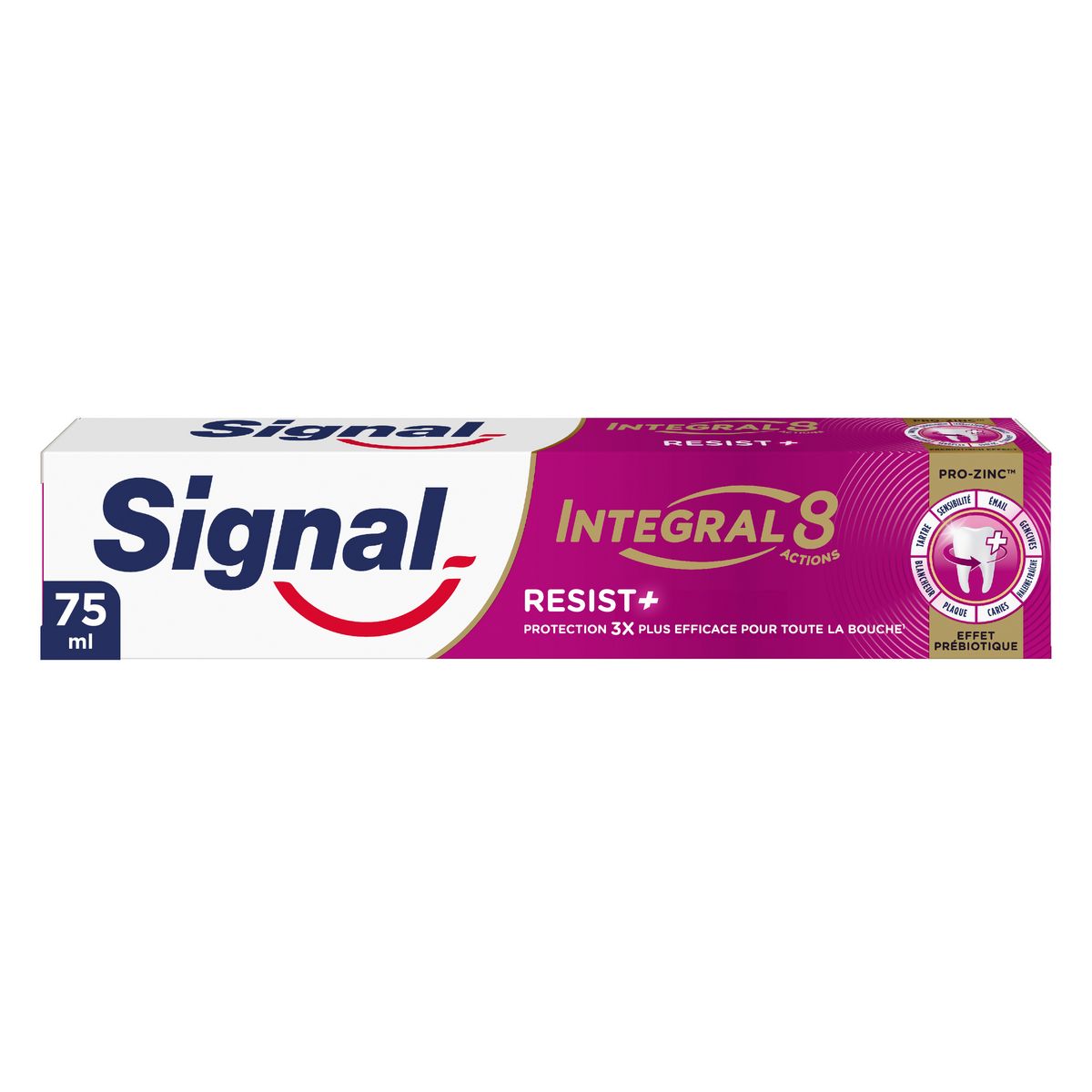 Pour une bouche intégralement protégée et en bonne santé jour après jour, choisissez Signal Integral 8 Resist +. Dotée d'un effet prébiotique, sa technologie PRO-ZINC™ renforce les défenses naturelles de votre bouche en augmentant les bonnes bactéries et en réduisant les mauvaises. Sa formule reminéralise et renforce les dents grâce au Fluor. Elle permet également une action antibactérienne de 24 h et une protection complète 3 x plus efficace¹ : dents, gencives, joue et langue saines. Composée de 96 % d'ingrédients d'origine naturelle, elle convient à toute la famille. Ce dentifrice Integral 8 offre 8 actions : protection caries, protection gencives, émail renforcé, action blancheur, haleine fraîche, anti-plaque, anti-tartre et anti-sensibilité. De plus, son tube est entièrement recyclable. Pour une bonne hygiène bucco-dentaire de toute la famille, suivez ces étapes simples : (1) le matin, brossez-vous les dents avec le dentifrice et la brosse à dents Signal, et rincez-vous la bouche avec le bain de bouche Signal. (2) Pendant la journée, rafraichissez votre haleine avec le bain de bouche Signal. (3) Le soir, brossez-vous les dents avec la brosse à dents et le dentifrice Signal et rincez-vous avec le bain de bouche Signal. Pensez à changer votre brosse à dents tous les 3 mois et vous rendre régulièrement chez le dentiste. ¹Étude in vivo sur la réduction des bactéries sur les dents, les gencives, les joues et la langue après 28 jours d'utilisation du produit avec un brossage deux fois par jour.