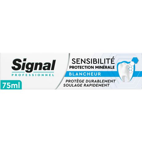 La sensibilité dentaire apparaît lorsque la densité minérale de votre émail diminue ou suite à des problèmes de récession gingivale. La formule du dentifrice Signal Professionnel Sensibilité Protection Minérale Blancheur contient un complexe de minéraux pour une protection complète et un soulagement rapide contre la sensibilité. Le Potassium minéral soulage la sensibilité dentaire*. Le minéral HAP aide à restaurer l'émail des zones sensibles avec le minéral dont il est naturellement constitué et prévient la sensibilité à sa source. Le Zinc minéral aide à réduire et prévenir les inflammations gingivales. Les minéraux blancheur aident à restaurer la blancheur naturelle des dents. Ce dentifrice contient 88 % d'ingrédients d'origine naturelle. Résultat de 10 ans de recherche par les Laboratoires Signal, il a été développé par une équipe d'experts dentaires et scientifiques. Découvrez également dans la même gamme les dentifrices Sensibilité Protection Minérale Complet et Sensibilité Protection Minérale Gencives. Chez Signal, nous pensons que votre sourire est l'expression de votre personnalité et de votre confiance en vous. Notre mission : améliorer la santé bucco-dentaire de tous, pour que chacun d'entre nous libère le pouvoir de son sourire. Signal accompagne les Français depuis 1961 pour leur transmettre les bons gestes dès le plus jeune âge et démontrer l'importance d'un brossage deux fois par jour, matin et soir, et de changer régulièrement de brosse à dents. Attentifs à la protection de la planète, nous prenons des mesures pour limiter l'impact environnemental de nos produits. Avec Signal, chaque sourire compte ! *Pour un soulagement rapide, appliquer une petite quantité de dentifrice sur le doigt et masser doucement la zone sensible de la dent pendant 30 secondes. À utiliser deux fois par jour pour une protection longue durée contre la sensibilité.