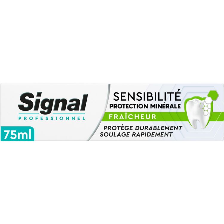 La sensibilité dentaire apparaît lorsque la densité minérale de votre émail diminue ou suite à des problèmes de récession gingivale. La formule du dentifrice Signal Professionnel Sensibilité Protection Minérale Fraîcheur contient un complexe de minéraux pour une protection complète et un soulagement rapide contre la sensibilité. Le Potassium minéral soulage la sensibilité dentaire*. Le minéral HAP aide à restaurer l'émail des zones sensibles avec le minéral dont il est naturellement constitué et prévient la sensibilité à sa source. Le Zinc minéral aide à réduire et prévenir les inflammations gingivales. Avec un goût mentholé pour une fraîcheur longue durée. Ce dentifrice contient 88 % d'ingrédients d'origine naturelle. Résultat de 10 ans de recherche par les Laboratoires Signal, il a été développé par une équipe d'experts dentaires et scientifiques. Découvrez également dans la même gamme le dentifrice Sensibilité Protection Minérale Complet et le dentifrice blancheur Sensibilité Protection Minérale Blancheur. Chez Signal, nous pensons que votre sourire est l'expression de votre personnalité et de votre confiance en vous. Notre mission : améliorer la santé bucco-dentaire de tous, pour que chacun d'entre nous libère le pouvoir de son sourire. Signal accompagne les Français depuis 1961 pour leur transmettre les bons gestes dès le plus jeune âge et démontrer l'importance d'un brossage deux fois par jour, matin et soir, et de changer régulièrement de brosse à dents. Attentifs à la protection de la planète, nous prenons des mesures pour limiter l'impact environnemental de nos produits. Avec Signal, chaque sourire compte ! *Pour un soulagement rapide, appliquer une petite quantité de dentifrice sur le doigt et masser doucement la zone sensible de la dent pendant 30 secondes. À utiliser deux fois par jour pour une protection longue durée contre la sensibilité.