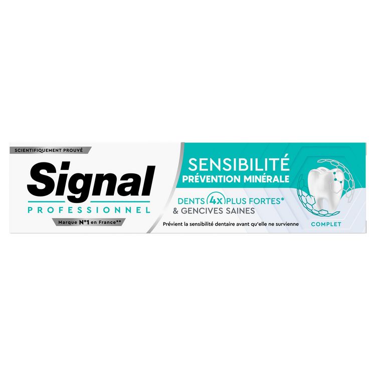 Le dentifrice Signal Professionnel Sensibilité Prévention Minérale Complet pour des dents 4 x plus fortes* et des gencives saines.