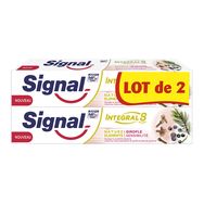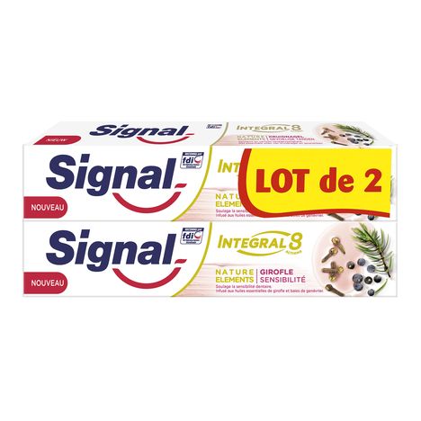 Signal Integral 8 Nature Elements, la protection complète pour toute la famille, inspirée par la nature. Sa formule douce associe des huiles essentielles au Zinc Minéral et apporte une action antibactérienne efficace. Formule cliniquement prouvée pour une protection complète. Aide à soulager rapidement la sensibilité dentaire. Infusé aux huiles essentielles de clou de girofle et baies de genévrier, connus pour leurs propriétés apaisantes. Formulé avec du Zinc Minéral. Sans Triclosan et Sans parabens. Le résultat : une protection complète, inspirée par la nature 8 actions pour : 1. Aider à protéger contre les caries 2. Renforcer les gencives 3. Offrir un effet anti-plaque jusqu'à 18h 4. Renforcer l'émail 5. Aider à retrouver la blancheur naturelle des dents 6. Rafraîchir l'haleine 7. Combattre la formation du tartre 8. Lutter contre les bactéries Signal accompagne les Français depuis 1961 et s’engage pour transmettre les bons gestes d’hygiène bucco-dentaire, et ce dès le plus jeune âge. Les bonnes habitudes doivent être prises par tous, c’est pourquoi Signal s’applique à démontrer l’importance d’un brossage deux fois par jour, matin et soir. De plus, la marque collabore étroitement avec de nombreux experts et est partenaire du Collège National des Chirurgiens-Dentistes Universitaires en Santé Publique. Signal s’est associé également à l’UNICEF dans le cadre d’un partenariat pour garantir aux enfants l’accès à l’eau potable et donc à l’hygiène dans les écoles du Mozambique. Enfin, la marque collabore étroitement avec de nombreux experts et est partenaire depuis 2009 du Collège National des Chirurgiens Dentistes Universitaires en Santé Publique. Conseils pour une bonne hygiène bucco-dentaire : brossez-vous les dents après chaque repas, changez de brosse à dents Signal tous les 2 à 3 mois et consultez votre dentiste au moins deux fois par an. Pensez également à couper l’eau pendant le brossage. Dentifrice