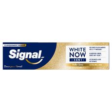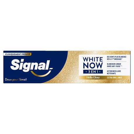 Testez le nouveau dentifrice blancheur Signal White Now 3 en 1 Hello Glow qui donne un sourire éclatant dès le premier brossage. Doté de la technologie Triple Light™, le dentifrice White Now 3 en 1 combine 3 actions blancheur tout en étant doux pour l'émail. La première action permet d'avoir des dents plus blanches dès le premier brossage* grâce à la technologie optique Bleu-Saphir avec des agents bleus qui corrigent instantanément la couleur de vos dents. La deuxième action permet une blancheur longue durée anti-tache** qui élimine les taches en 3 jours seulement et crée un bouclier qui protège durablement vos dents contre les taches. La troisième action est une action micellaire nettoyante grâce à une mousse riche qui élimine en douceur les impuretés tout en respectant l'émail. Cliniquement prouvé, le dentifrice White Now 3 en 1 contient 96 % d'ingrédients d'origine naturelle tout en étant doux pour l'émail, pour des dents plus blanches sans compromis. Dans la même gamme, découvrez Signal White Now 3 en 1 White Boost au charbon actif pour un sourire purifié et naturellement plus blanc. Chez Signal, nous pensons que votre sourire est l'expression de votre personnalité et de votre confiance en vous. Notre mission : améliorer la santé bucco-dentaire de tous, pour que chacun d'entre nous libère le pouvoir de son sourire. Signal accompagne les Français depuis 1961 pour leur transmettre les bons gestes, dès le plus jeune âge et démontrer l'importance d'un brossage 2 fois par jour, matin et soir. Attentifs à la protection de la planète, nous prenons des mesures pour limiter l'impact environnemental de nos produits. *Effet blancheur instantané, optique et temporaire. Cliniquement prouvé sur 54 personnes comparé à un dentifrice fluoré standard. **Testé cliniquement sur 59 personnes avec un brossage deux fois par jour pendant 2 semaines
