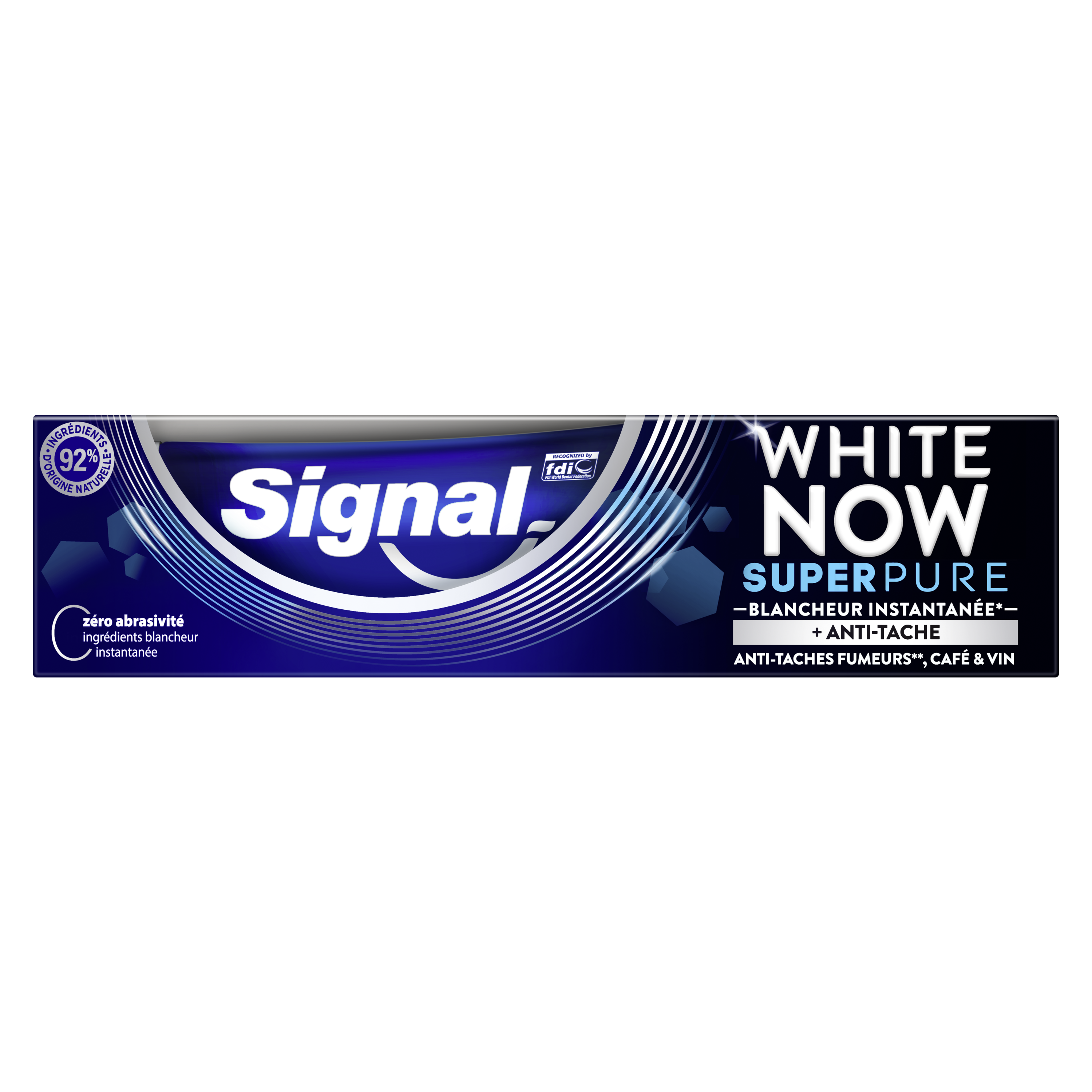 Le dentifrice Signal White Now SUPER PURE vous offre un sourire plus beau et plus éclatant ! Sa formule à l'efficacité cliniquement prouvée rend les dents plus blanches instantanément* grâce à la technologie White-Correct et à ses pigments bleu-saphir, qui créent un effet blancheur unique. Formulé avec des ingrédients blancheur instantanée non abrasifs, il convient à un usage quotidien et permet d’enlever progressivement les taches sur les dents. Ce dentifrice cible efficacement les taches de nicotine**, café et vin rouge pour une action blancheur continue. **Étude scientifique montrant la réduction des taches des fumeurs Signal accompagne les Français depuis 1961 et s’engage pour transmettre les bons gestes d’hygiène bucco-dentaire, et ce dès le plus jeune âge. Les bonnes habitudes doivent être prises par tous, c’est pourquoi Signal s’applique à démontrer l’importance d’un brossage 2 fois par jour, matin et soir. Conseils pour une bonne hygiène bucco-dentaire : brossez-vous les dents après chaque repas, changez de brosse à dents Signal tous les 2 à 3 mois et consultez votre dentiste au moins 2 fois par an. Pensez également à couper l’eau pendant le brossage. *Cliniquement prouvé sur 107 personnes. Effet blancheur instantané optique et temporaire. Découvrez également d'autres dentifrices, au sein de la marque Signal, comme le dentifrice White Now GOLD et White Now Detox Argile Minérale et Charbon Actif Dentifrice Blancheur