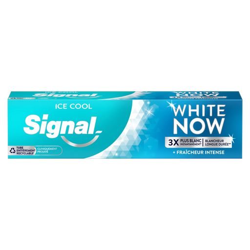 La nouvelle formule du dentifrice Signal White Now Ice Cool vous procure un sourire 3 x plus blanc instantanément¹ et une sensation de fraîcheur intense pour longtemps ! Elle combine deux technologies cliniquement prouvées : la technologie White-Correct + avec des pigments bleu-saphir et verts qui corrigent la couleur de vos dents, pour un sourire 3 x plus blanc instantanément¹ et la technologie White-Infinity avec des minéraux d'origine naturelle qui nettoient les dents et aident à retirer les taches progressivement pour une blancheur longue durée². Cette formule améliorée comprend 94 % d'ingrédients d'origine naturelle. Cliniquement prouvé et respectueux de l'émail, White Now Ice Cool contient des ingrédients blancheur instantanée non abrasifs et du fluor pour un usage quotidien. De plus, le carton et le tube souple de ce dentifrice composé de 22 % de plastique recyclé sont maintenant entièrement recyclables. Chez Signal, nous pensons que votre sourire est l'expression de votre personnalité et de votre confiance en vous. Notre mission : améliorer la santé bucco-dentaire de tous, pour que chacun d'entre nous libère le pouvoir de son sourire. Signal accompagne les Français depuis 1961 pour leur transmettre les bons gestes, dès le plus jeune âge et démontrer l'importance d'un brossage 2 fois par jour, matin et soir. Attentifs à la protection de la planète, nous prenons des mesures pour limiter l'impact environnemental de nos produits. ¹Cliniquement prouvé sur 58 personnes comparé à un dentifrice fluoré standard. Effet blancheur instantanée optique et temporaire. ²Testé cliniquement sur 58 personnes avec un brossage deux fois par jour pendant 4 semaines. ³ Le produit peut laisser des taches sur les textiles et les plastiques (ex : brosses à dents). Lavez-les régulièrement.