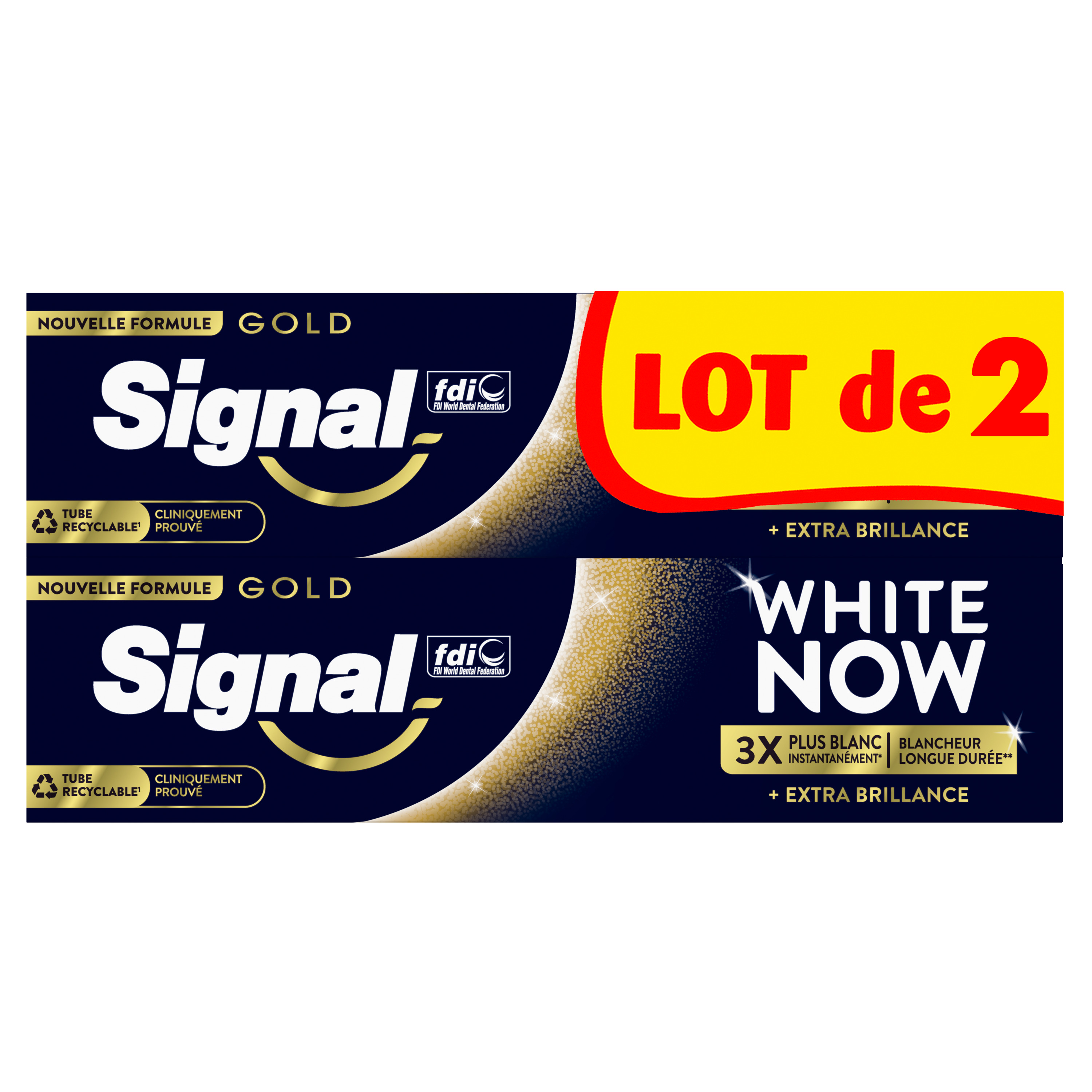 La nouvelle formule du dentifrice Signal White Now Gold procure 3 teintes de blanc en plus instantanément¹ pour un sourire éclatant ! Elle combine deux technologies cliniquement prouvées : la technologie White-Correct + avec des pigments bleu-saphir et verts qui corrigent la couleur de vos dents, pour un sourire 3 x plus blanc instantanément¹ et la technologie White-Infinity avec des minéraux d'origine naturelle qui nettoient les dents et aident à retirer les taches progressivement pour une blancheur longue durée². Cette formule améliorée comprend 94 % d'ingrédients d'origine naturelle. Cliniquement prouvé et respectueux de l'émail, White Now Gold contient des ingrédients blancheur instantanée non abrasifs et du fluor pour un usage quotidien. De plus, le carton et le tube souple de ce dentifrice composé de 22 % de plastique recyclé sont maintenant entièrement recyclables. Chez Signal, nous pensons que votre sourire est l'expression de votre personnalité et de votre confiance en vous. Notre mission : améliorer la santé bucco-dentaire de tous, pour que chacun d'entre nous libère le pouvoir de son sourire. Signal accompagne les Français depuis 1961 pour leur transmettre les bons gestes, dès le plus jeune âge et démontrer l'importance d'un brossage 2 fois par jour, matin et soir. Attentifs à la protection de la planète, nous prenons des mesures pour limiter l'impact environnemental de nos produits. ¹Cliniquement prouvé sur 58 personnes comparé à un dentifrice fluoré standard. Effet blancheur instantanée optique et temporaire. ²Testé cliniquement sur 58 personnes avec un brossage deux fois par jour pendant 4 semaines.