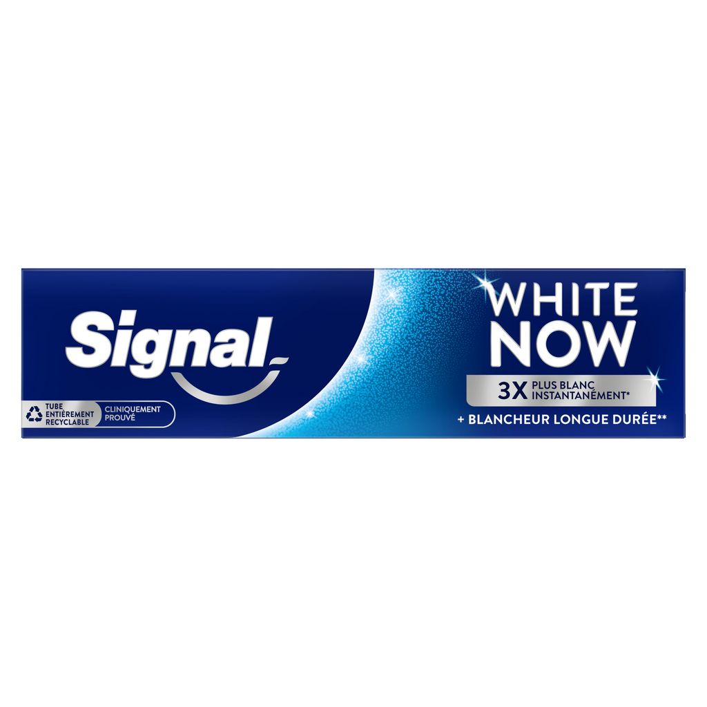 La nouvelle formule du dentifrice blancheur Signal White Now Original vous garantit un sourire éclatant dès le premier brossage.