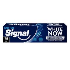 La nouvelle formule du dentifrice Signal White Now Super Pure aide à éliminer les taches, même les plus tenaces comme le vin, le café et le tabac. Elle combine deux technologies cliniquement prouvées : la technologie White-Correct + avec des pigments bleu-saphir et verts qui corrigent la couleur de vos dents, pour un sourire 3 x plus blanc instantanément¹ et la technologie White-Infinity avec des minéraux d'origine naturelle qui nettoient les dents et aident à retirer les taches progressivement pour une blancheur longue durée². Cette formule améliorée comprend 94 % d'ingrédients d'origine naturelle. Cliniquement prouvé et respectueux de l'émail, White Now Super Pure contient des ingrédients blancheur instantanée non abrasifs et du fluor pour un usage quotidien. De plus, le carton et le tube souple de ce dentifrice composé de 22 % de plastique recyclé sont maintenant entièrement recyclables. Découvrez aussi nos dentifrices White Now Gold et Blancheur Sensitive. Chez Signal, nous pensons que votre sourire est l'expression de votre personnalité et de votre confiance en vous. Notre mission : améliorer la santé bucco-dentaire de tous, pour que chacun d'entre nous libère le pouvoir de son sourire. Signal accompagne les Français depuis 1961 pour leur transmettre les bons gestes, dès le plus jeune âge et démontrer l'importance d'un brossage 2 fois par jour, matin et soir. Attentifs à la protection de la planète, nous prenons des mesures pour limiter l'impact environnemental de nos produits. ¹Cliniquement prouvé sur 58 personnes comparé à un dentifrice fluoré standard. Effet blancheur instantanée optique et temporaire. ²Testé cliniquement sur 58 personnes avec un brossage deux fois par jour pendant 4 semaines. ³ Le produit peut laisser des taches sur les textiles et les plastiques (ex : brosses à dents). Lavez-les régulièrement.