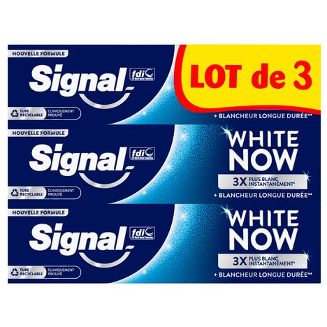 La nouvelle formule du dentifrice Signal White Now Original 3 x 75 ml combine deux technologies cliniquement prouvées : la technologie White-Correct + avec des pigments bleu-saphir et verts qui corrigent la couleur de vos dents, pour un sourire 3 x plus blanc instantanément¹ et la technologie White-Infinity avec des minéraux d'origine naturelle qui nettoient les dents et aident à retirer les taches progressivement pour une blancheur longue durée². Cette formule améliorée comprend 94 % d'ingrédients d'origine naturelle. Cliniquement prouvé et respectueux de l'émail, White Now Original contient des ingrédients blancheur instantanée non abrasifs et du fluor pour un usage quotidien. De plus, le carton et le tube souple de nos dentifrices Signal White Now Original composé de 22 % de plastique recyclé sont maintenant entièrement recyclables. Chez Signal, nous pensons que votre sourire est l'expression de votre personnalité et de votre confiance en vous. Notre mission : améliorer la santé bucco-dentaire de tous, pour que chacun d'entre nous libère le pouvoir de son sourire. Signal accompagne les Français depuis 1961 pour leur transmettre les bons gestes, dès le plus jeune âge et démontrer l'importance d'un brossage 2 fois par jour, matin et soir. Attentifs à la protection de la planète, nous prenons des mesures pour limiter l'impact environnemental de nos produits. ¹Cliniquement prouvé sur 58 personnes comparé à un dentifrice fluoré standard. Effet blancheur instantanée optique et temporaire. ²Testé cliniquement sur 58 personnes avec un brossage deux fois par jour pendant 4 semaines. ³ Le produit peut laisser des taches sur les textiles et les plastiques (ex : brosses à dents). Lavez-les régulièrement.