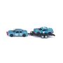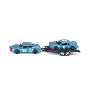 Coffret course avec la puissance des huit cylindresQuel tandem ! Quelle peinture ! La Dodge Charger tracte la Dodge Challenger SRT Racing sur une remorque vers le prochain essai sur piste. Lentement, la remorque bascule et le monstrueux V8 bleu ciel recule. Portière ouverte, dernières consignes au pilote. Le numéro 42 est parfaitement prêt pour l'échauffement. Elle sort des stands en vrombissant pour s'élancer sur le circuit. Les pneus en caoutchouc sur les jantes sportives sont amenés à température ambiante, puis : il ne reste plus qu'à enfoncer l'accélérateur pour libérer les 700 CV. Vroum ! Dimensions du produit l x p x h (mm)200x51x34 Echelle 1:55ème Matériaux: Métal et plastique