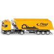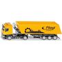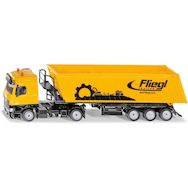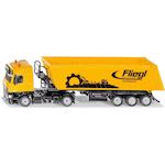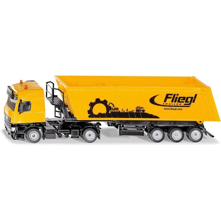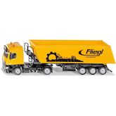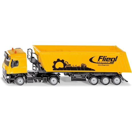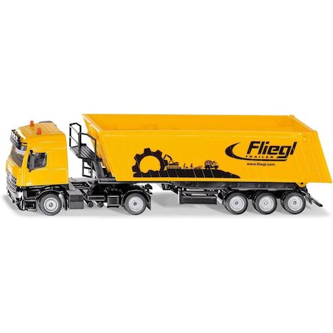 Camion avec remorque benne basculante Echelle : 1:50eme. La nouvelle cabine de conduite Mercedes Actros avec spoilers sous forme de tracteur à deux essieux constitue la base impressionnante du camion avec benne basculante. La semi-remorque à trois essieux avec benne de la marque Fliegl est équipée d'un châssis métallique. La benne basculante tout comme l'accès à la plateforme monté sur le châssis sont réalisés en plastique. Les béquilles mobiles et la ridelle arrière ouvrante de la benne complètent de manière impressionnante l'aspect de cet énorme semi-remorque destiné aux chantiers et au transport agricole.