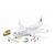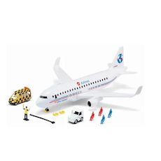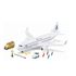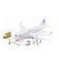 Le grand avion (38,5 cm) avec les deux puissants réacteurs est prêt pour l'embarquement. Le personnel de cabine peut simplement relever la trappe avant dans le toit et installer les quatre passagers qui ont déjà pris place. La trappe arrière offre la place dans la soute pour la voiture favorite qui peut être emmenée en vacances. Prêt pour le décollage. L'avion est sur la ligne de départ. Pleins gaz, l'avion prend de la vitesse, s'envole et le train d'atterrissage peut être rentré. Préparer l'atterrissage / sortir le train d'atterrissage et allumer les phares d'atterrissage.