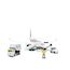 Le grand avion (38,5 cm) avec les deux puissants réacteurs est prêt pour l'embarquement. Le personnel de cabine peut simplement relever la trappe avant dans le toit et installer les quatre passagers qui ont déjà pris place. La trappe arrière offre la place dans la soute pour la voiture favorite qui peut être emmenée en vacances. Prêt pour le décollage. L'avion est sur la ligne de départ. Pleins gaz, l'avion prend de la vitesse, s'envole et le train d'atterrissage peut être rentré. Préparer l'atterrissage : sortir le train d'atterrissage et allumer les phares d'atterrissage. La LED s'éteint automatiquement après dix minutes de fonctionnement. L'avion a atterri, et un véhicule-guide luxueusement imprimé doté de gyrophares lui indique le chemin sur le tarmac. Une secousse et le gros avion s'accroche à la barre d'attelage du tracteur d'avion. Le marshaller guide le pilote vers la position de stationnement définitive.