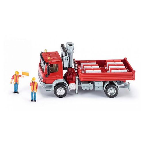Découvrez le Mercedes Atego avec grue à l'échelle 1:50. La grue de chargement a été inspirée de l'original de la société Palfinger. Cabine, châssis et carrosserie sont en très grande partie en métal. De nombreux détails ont été mis en forme avec passion. La grue est rotative et se déploie de façon exemplaire en position de travail via plusieurs articulations en pivot. Ce modèle présente deux appuis amovibles. Le plateau peut basculer. Des accessoires tels que des ouvriers de chantier et des blocs guidant le trafic complètent ce modèle. Dès 3 ans