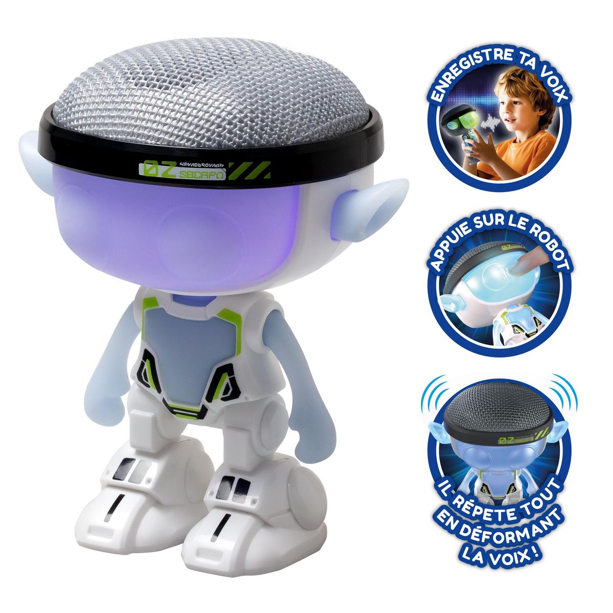 YCOO – TALKIMON. Un robot interactif qui enregistre la voix et la répète en la modifiant avec des effets sonores ! Sa matière sensorielle est agréable. Appuie sur sa tête pour enregistrer ta voix. Effets sonores et lumineux. Il s’allume et brille !