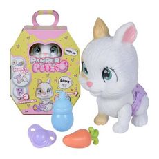 Le Smoby - Pamper Petz - Lapin à adopter est un jouet interactif conçu pour les enfants à partir de 3 ans. Ce charmant lapin articulé est livré avec quatre accessoires : un biberon, une sucette, une carotte et un certificat d'adoption. Le lapin peut boire et faire pipi, ajoutant une touche réaliste et éducative à l'expérience de jeu.