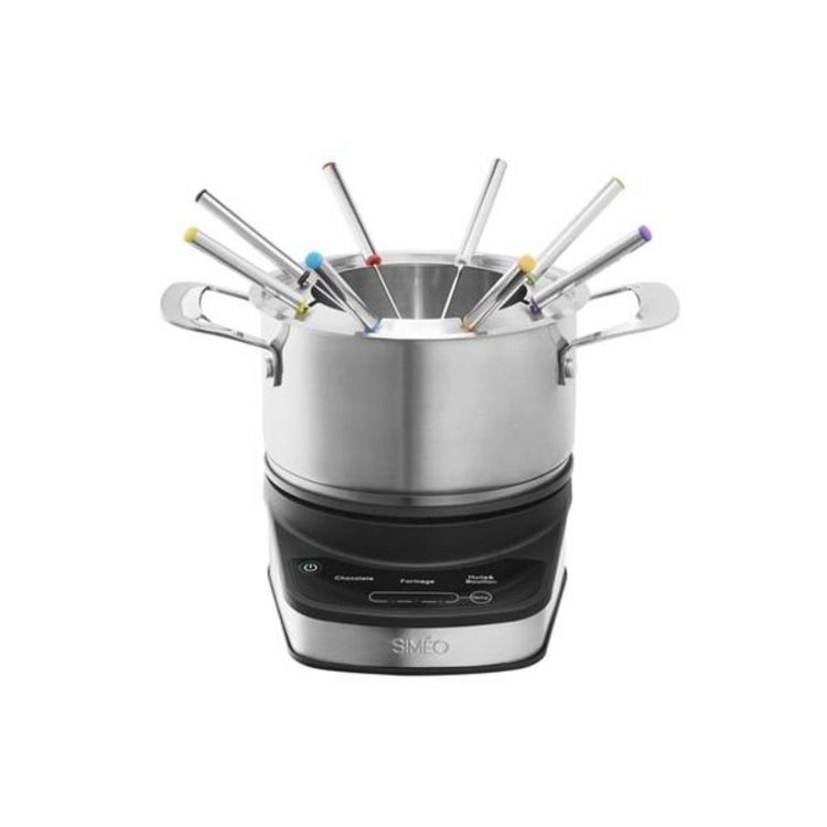 Simeo FDI720 Service à fondue FDI720 de SimeoChaque mode est programmé pour réaliser la fondue dédiée en toute simplicité, la température est justement réglée pour un résultat parfait.Chaque mode de cuisson peut être personnalisé grâce aux 3 niveaux de températures complémentaires.Les recettes sont