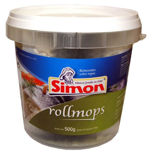 Ingrédients : Rollmops 60% (hareng (clupea harengus), oignons), eau, conservateur: acide acétique, sel, saccharine, arôme naturel d'épices (contient de la moutarde). Peut contenir des traces de gluten (blé), céleri, lait, œuf, mollusques.