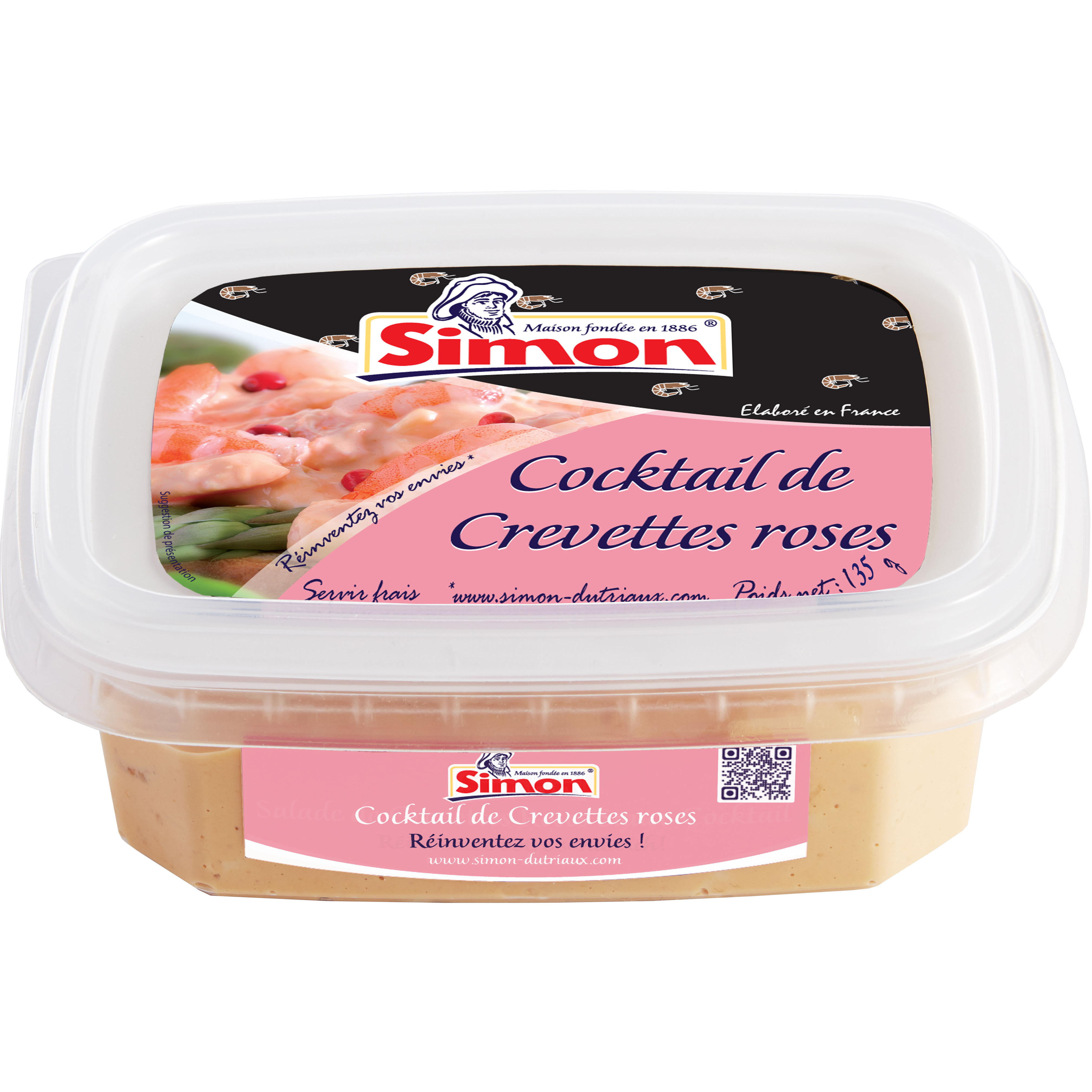 Ingrédients : Sauce cocktail 50% (huile de colza, concentré de tomates, sucre, vinaigre, jaune d'œufs, moutarde (eau, graines de moutarde, vinaigre, sel, épices), eau, whisky 0.6%, arôme, extraits (romarin, thé vert, sucre brûlé, tamarin, levure, noix de muscade, clous de girofle, poivre, céleri), sel, acidifiant: E330, conservateurs: E211- E202, colorant: E160a), crevettes roses (crustacés) 35% (crevettes, sel, colorant: E160c), œufs, épaississant: E415. Traces éventuelles de lait et poisson.