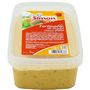 Ingrédients : Sauce 48.8% (huile de colza, eau, vinaigre, jaune d'oeufs, concentré de tomates 2.7%, moutarde 1% (eau, graines de moutarde, vinaigre, sel, épices), sel, extraits naturels( curcuma, cumin, poivre, clou de girofle, gingembre, coriandre, ail, cannelle, céleri), sucre, poudre d'oignon, acidifiant: E330, épaississant: E415, extrait de thé vert et de romarin, colorant: E160a, conservateur: E202), poulet 39% (origine: Union Européenne; poulet 37%, dextrose, sel, fécule de pomme de terre), légumes (carottes, oignons, poivrons rouges). Trcaes éventuelles de poisson, crustacés et lait.