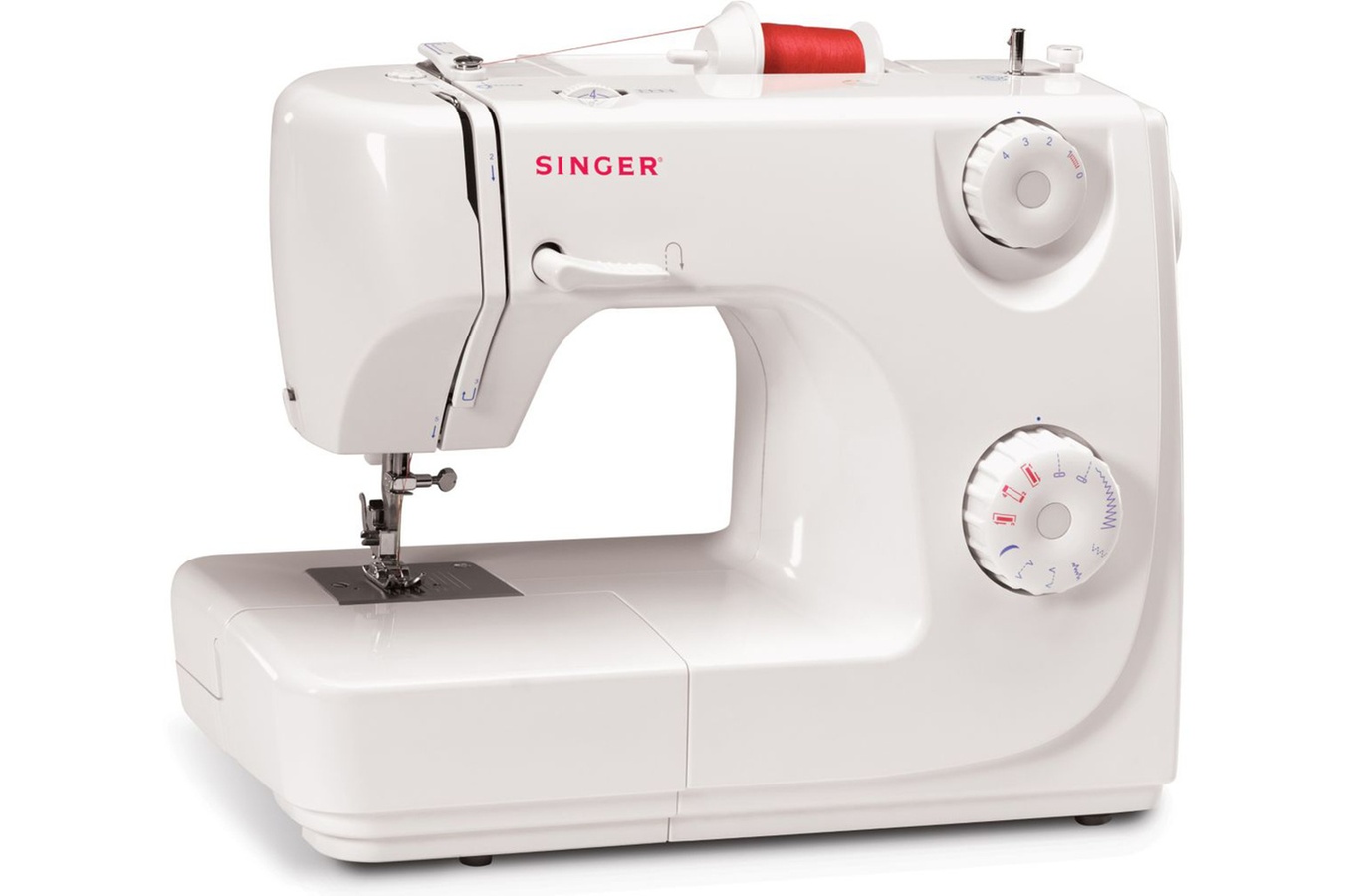 Enfilage simplifié, Boutonnière automatique en 4 temps, Eclairage du plan à coudre, Bras libre, Blanc/Rouge