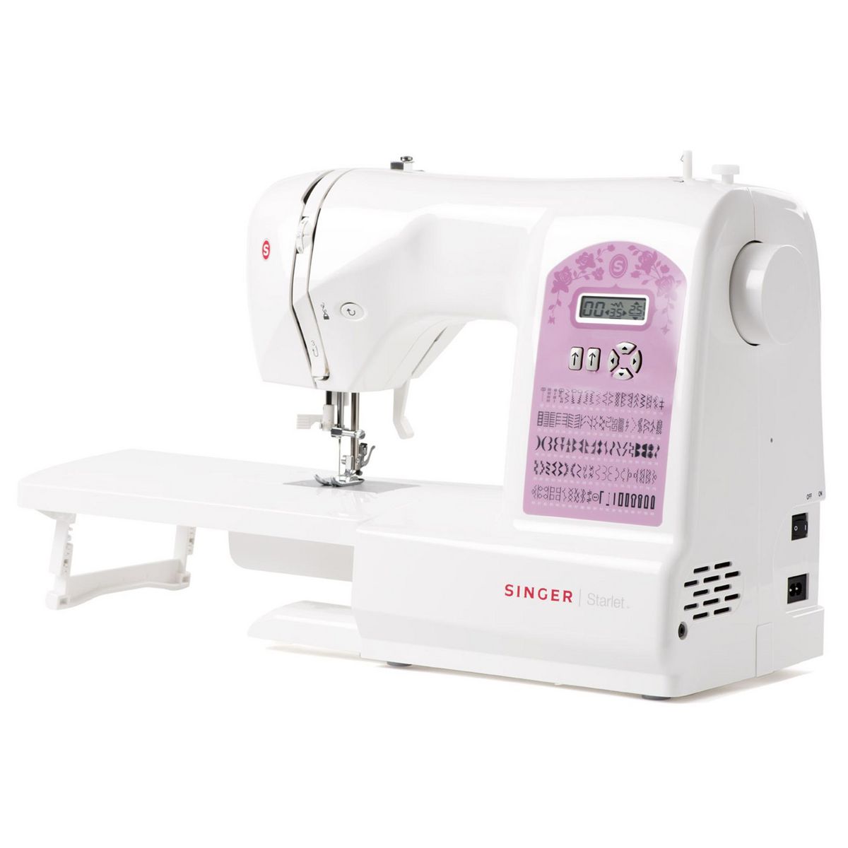 Une machine à coudre électronique avec points décoratifs, enfilage facile et plus encore ! Valise rigide et table de rallonge sont compris.