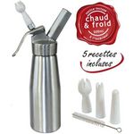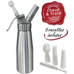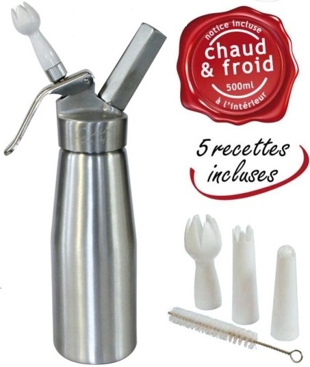 Préparez en toute simplicité votre chantilly et mousses sucrées ou salées. Livré avec 3 embouts, un goupillon et 1 livre de recettes.