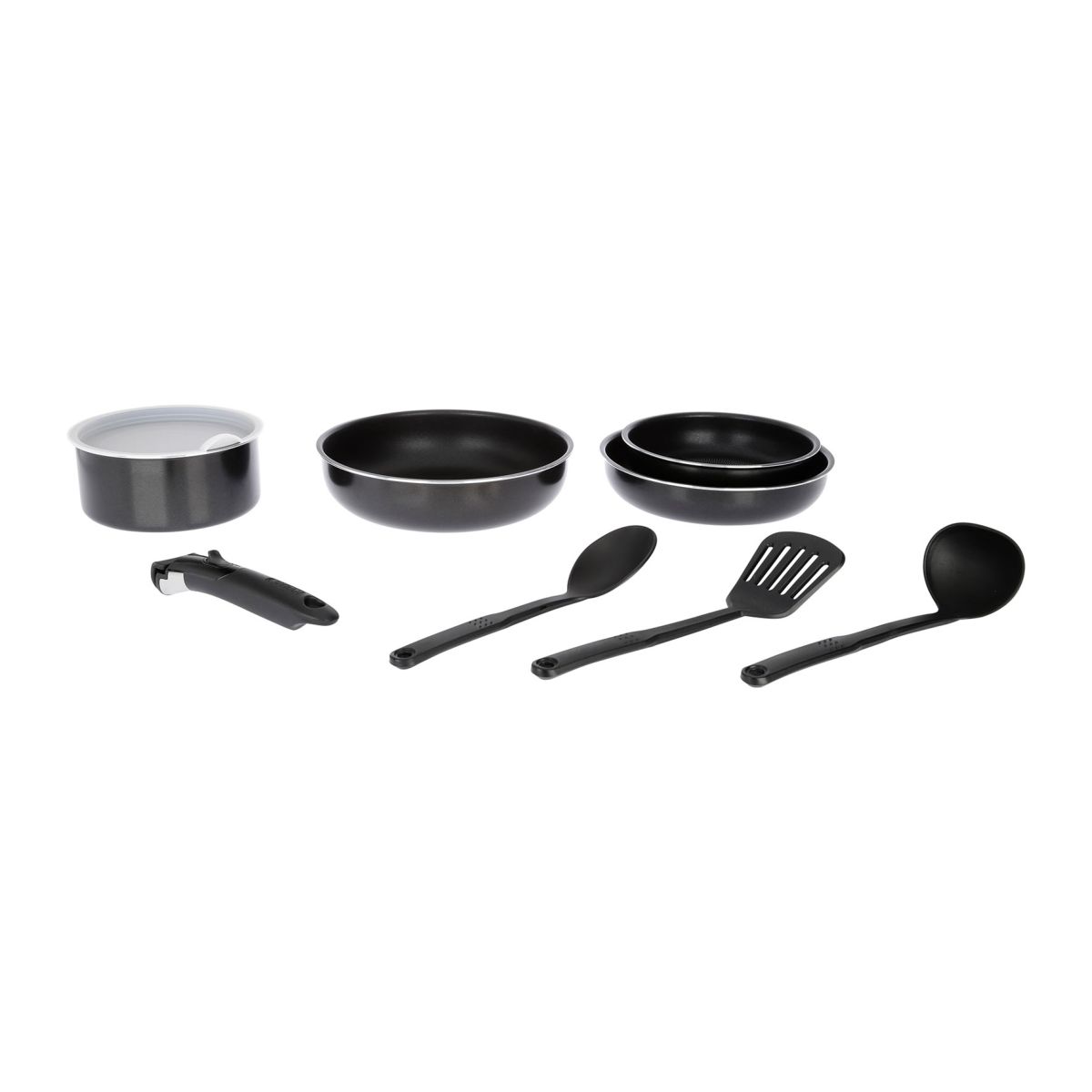 2 poêles 22/26cm + 1 casserole 18cm + 1 couvercle en plastique 18cm + 1 sauteuse 24cm + 1 couvercle en verre 24cm + 1 spatule + 1 cuillère + 1 louche en nylon + 1 poignée amovible