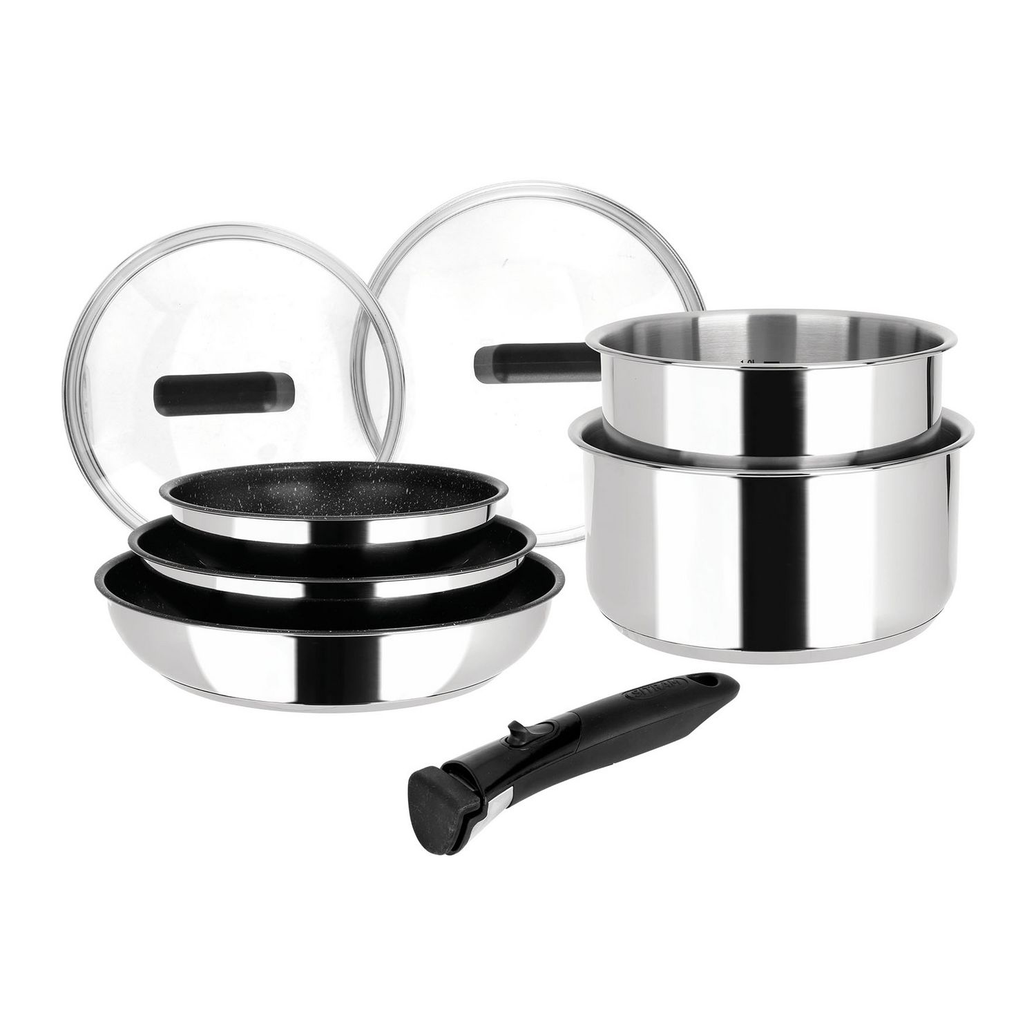 Batterie de cuisine 8 pièces Inox Gamme SITRAMOVIBLE ARPEGE Revêtement intérieur antiadhésif Whitford Xylan 2 couches effet pierre sans PFO Avec manche amovible SITRAMOVIBLE Composition : - 3 poêles Ø 20-24-28 cm - 2 casseroles Ø 16-18 cm - 2 couvercles verre Ø 16-18 cm Tous feux dont induction