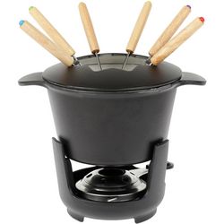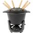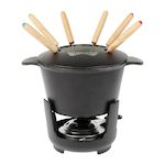 Parfait pour un repas entre amis ce service à fondue en fonte émaillée de la gamme TRAIDFONTE, diamètre 16 cm Revêtement intérieur émaillé blanc et extérieur noir. Avec 6 fourchettes, 1 caquelon, 1 couvercle, 1 support en fonte et 1 bruleur.