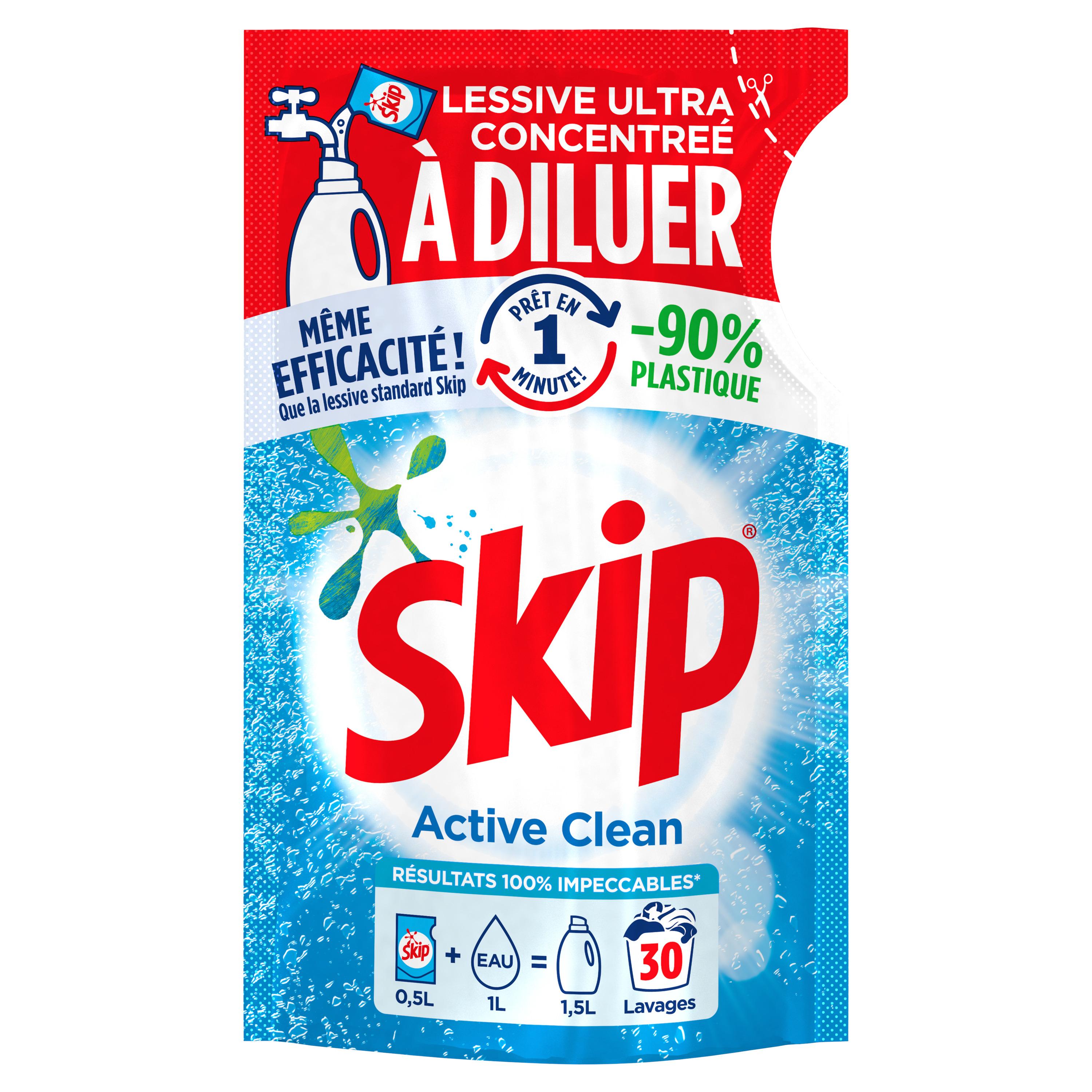 Skip lance une innovation majeure sur la lessive : la 1ʳᵉ lessive à diluer ! Plus pratique à transporter et à stocker avec son format de 500 ml, plus économique au lavage et plus écologique, avec 90 % de plastique en moins par rapport à une bouteille de lessive liquide Skip Active Clean 34 lavages. La technologie unique de la lessive à diluer Skip Active Clean garantit le même résultat impeccable sur différents types de taches (chocolat, huile, confiture), tout en offrant le même parfum longue durée que votre lessive liquide Skip Active Clean. De plus, sa formule contient des ingrédients actifs d'origine végétale et biodégradable comme notre lessive liquide standard. Utiliser la lessive à diluer Skip Active Clean, c'est très simple. - Versez 1 L d'eau du robinet dans une bouteille vide d'au moins 1,5 L. - Ajoutez la lessive à diluer Skip Active Clean, soit l'intégralité d'un écopack (500 ml). - Fermez votre bouteille et agitez-la en comptant jusqu'à 10. - Votre lessive est prête à être utilisée pour 30 lavages ! Dosez 50 ml pour un lavage comme avec votre lessive habituelle. Prêt à faire un geste pour l'environnement et pour votre porte-monnaie ? Essayez la lessive à diluer Skip Active Clean. Toute l'efficacité des lessives Skip pour vos vêtements, dans un format plus pratique, économique et écologique. Skip, ce sont plus de 60 ans d'expertise et d'innovations dans le domaine des lessives, toujours guidées par une volonté d'améliorer le quotidien des familles. Skip, c'est aussi une philosophie de marque unique ! Chez Skip, nous sommes convaincus que nos enfants ont besoin d'expérimenter, de jouer dehors et de découvrir le monde qui les entoure en toute sérénité, afin de se préparer à demain. Ainsi, chaque tache peut être synonyme d'un moment de joie et de partage, d'un challenge réussi ou d'une nouvelle aventure. Pour nous, la saleté des vêtements est la marque de l'action. C'est pourquoi nos lessives sont efficaces sur les taches, même les plus tenaces. Avec Skip, la saleté, c'est bien et ça le sera toujours. Skip s'engage à prendre soin de votre linge à l'épreuve de la vie et du quotidien !