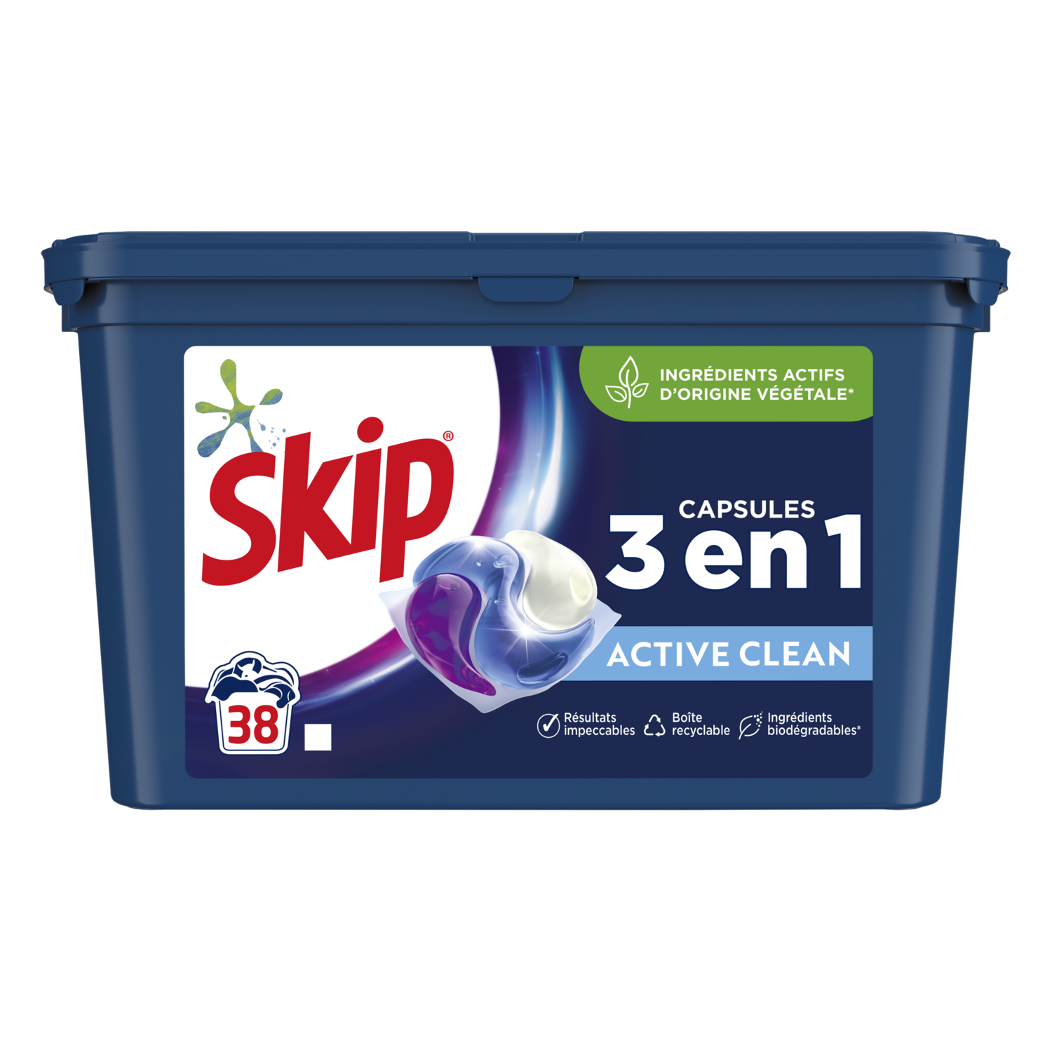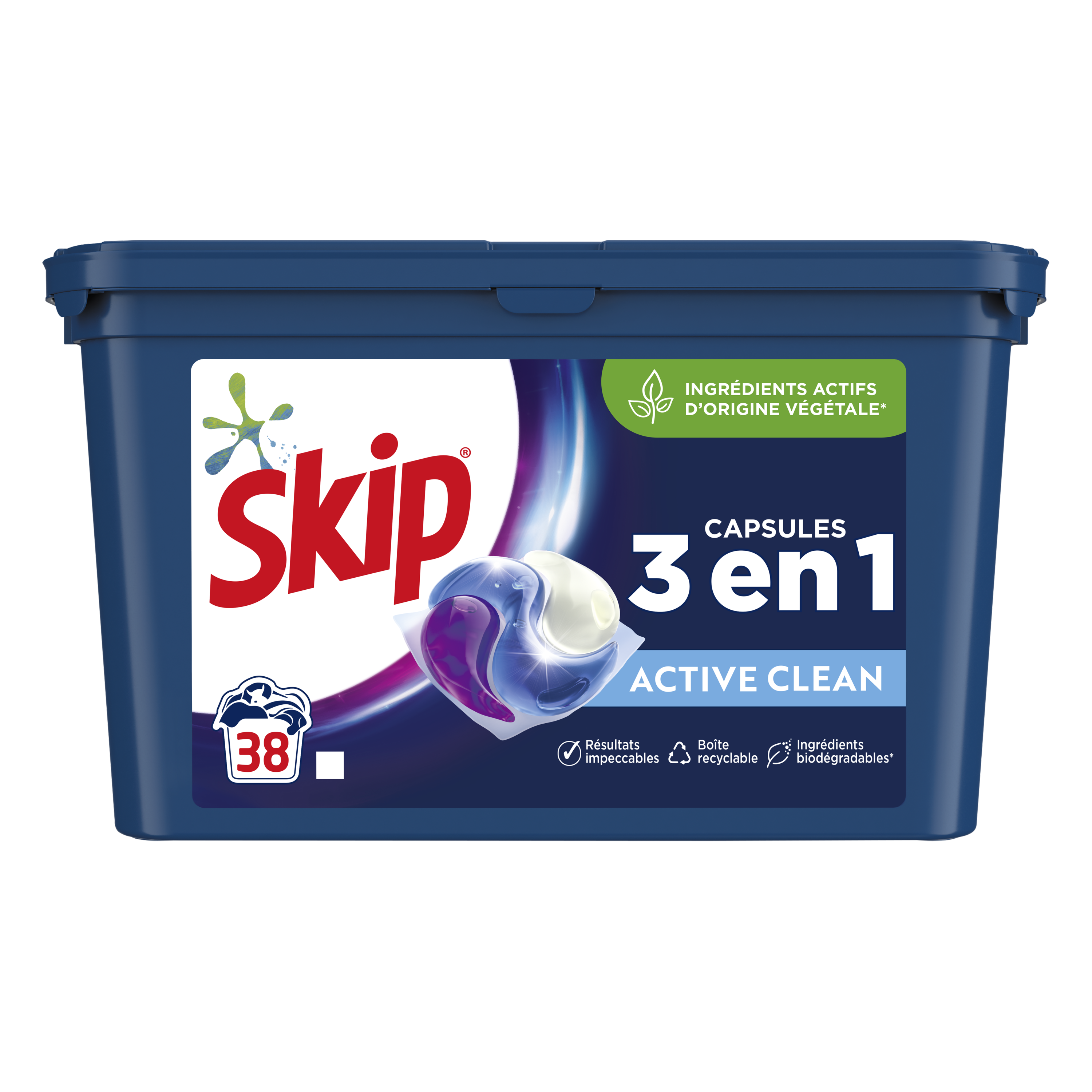Découvrez les premières lessives avec dosettes à 3 compartiments Skip Ultimate, pour 3 pouvoirs : - Efficacité contre les taches même les plus tenaces?; - Soin des fibres?; - Fraîcheur longue durée ; pour le meilleur des résultats?!* Les nouvelles capsules Skip Ultimate Active Clean vous garantissent une propreté impeccable et un linge éclatant, grâce à leur technologie triple compartiment et leur cocktail d’enzymes qui permet d’enlever les taches les plus tenaces comme la sauce tomate, le chocolat, le thé, l’huile, les fruits rouges ou encore l’herbe. 1 dosette suffit pour nettoyer le linge en profondeur, vous assurer un résultat parfait et une dissolution optimale même en cycle court. La lessive capsules Skip Ultimate Active Clean vous garantit le meilleur des résultats* en toute simplicité ! Existe aussi en variante Fraîcheur Intense, Hygiène, Sensitive et Couleurs & Fibres. Pour le meilleur des résultats : 1) Placez une capsule au fond du tambour vide 2) Déposez votre linge 3) Un résultat parfait ! Sécurité renforcée à l’ouverture. Toujours tenir hors de portée des enfants. Plus d’informations sur www.keepcapsfromkids.eu. Skip, ce sont plus de 50 ans d’expertise et d’innovations dans le domaine des lessives, toujours guidées par une forte volonté d’améliorer le quotidien des familles. Skip, c’est également une philosophie de marque unique ! Chez Skip, nous sommes convaincus que nos enfants ont besoin d’expérimenter, de jouer dehors et de découvrir le monde qui les entoure en toute sérénité, afin de se préparer à demain ! Ainsi, chaque tache peut être synonyme d’un moment de joie et de partage, d’un challenge réussi ou d’une nouvelle aventure. C’est pourquoi nos lessives sont efficaces sur les taches même les plus tenaces : pour laisser aux enfants la liberté de se salir ! C’est d’ailleurs pour cela que Skip soutient depuis 2016 la Journée École en Plein Air, une initiative internationale destinée à encourager les enfants à apprendre et à jouer en pleinair ! « Libre de se salir », c’est la garantie d’une marque experte en la matière, grâce à laquelle vous n’aurez plus à vous soucier des taches ! Renseignements sur www.skip.fr et www.journeeecoleenpleinair.fr. *Au sein de la gamme Skip Capsules Lessive Trio Capsules