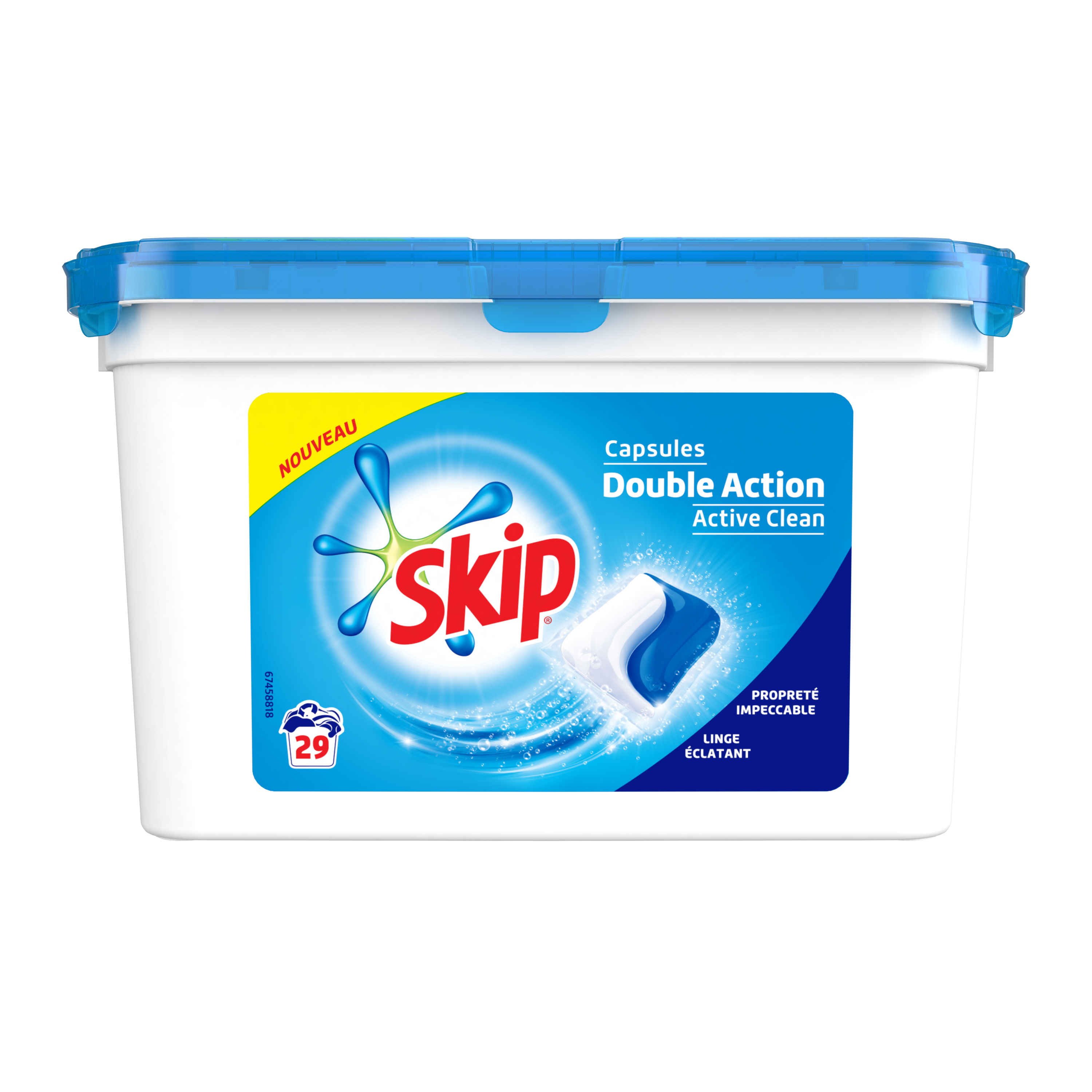 Les nouvelles capsules Skip Double Action vous garantissent : - Une propreté impeccable? - Un linge éclatant ! 1 dosette suffit pour laver le linge en profondeur. Un résultat parfait même en cycle court pour assurer un soin complet à votre linge. Grâce à leur technologie double compartiment et leur format pré-dosé, les capsules Skip Double Action Active Clean est la lessive idéale pour les lavages à basse température et l’entretien de tous les textiles. La capsule Double Action se dissout instantanément et pénètre au cœur du linge. Elle vous garantit des résultats impeccables tout en prenant soin de votre linge et laisse un parfum agréable qui dure longtemps sur vos vêtements ! Existe aussi en variante Fraîcheur Intense, Hygiène, Sensitive et Touches d’Agrumes. Pour le meilleur des résultats : 1) Placez une capsule au fond du tambour vide 2) Déposez votre linge 3) Un résultat parfait ! Sécurité renforcée à l’ouverture. Toujours tenir hors de portée des enfants. Plus d’informations sur www.keepcapsfromkids.eu. Skip, ce sont plus de 50 ans d’expertise et d’innovations dans le domaine des lessives, toujours guidées par une forte volonté d’améliorer le quotidien des familles. Skip, c’est également une philosophie de marque unique ! Chez Skip, nous sommes convaincus que nos enfants ont besoin d’expérimenter, de jouer dehors et de découvrir le monde qui les entoure en toute sérénité, afin de se préparer à demain ! Ainsi, chaque tache peut être synonyme d’un moment de joie et de partage, d’un challenge réussi ou d’une nouvelle aventure. C’est pourquoi nos lessives sont efficaces sur les taches même les plus tenaces : pour laisser aux enfants la liberté de se salir ! C’est d’ailleurs pour cela que Skip soutient depuis 2016 la Journée École en Plein Air, une initiative internationale destinée à encourager les enfants à apprendre et à jouer en plein air ! « Libre de se salir », c’est la garantie d’une marque experte en la matière, grâce à laquelle vous n’aurez plus à vous soucier des taches ! Plus d’informations sur www.skip.fr et www.journeeecoleenpleinair.fr. Skip Lessive Capsules Active Clean 29 Dosettes