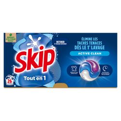 Le pack de 26 lessive capsules Skip Tout en 1 Active Clean vous garantit des résultats impeccables, même en cycle court et à froid.