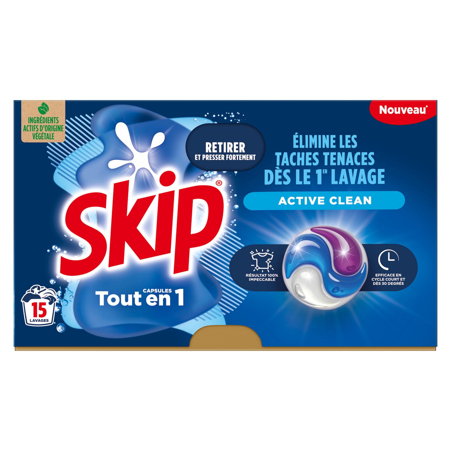 Les 15 lessive capsules Skip 3-en-1 Active Clean vous garantissent une propreté impeccable et un linge éclatant, grâce à leur technologie triple compartiment qui permet d'enlever les tâches les plus tenaces comme la sauce tomate, le chocolat, le thé, l'huile, les fruits rouges ou encore l'herbe. Toute l'efficacité Skip est maintenant contenue dans une lessive en capsules, avec des ingrédients actifs d'origine végétale et toujours la garantie de résultats impeccables ! La boîte de votre lessive en capsules Skip est entièrement recyclable. 1 lessive liquide en capsule suffit pour nettoyer le linge en profondeur, vous assurer un résultat parfait et une dissolution optimale même en cycle court. Cette lessive permet 15 lavages.