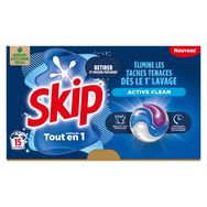 Le pack de lessive capsules Skip 3-en-1 Active Clean permet 15 lavages et vous garantit des résultats 100% impeccables, même en cycle court et à froid.