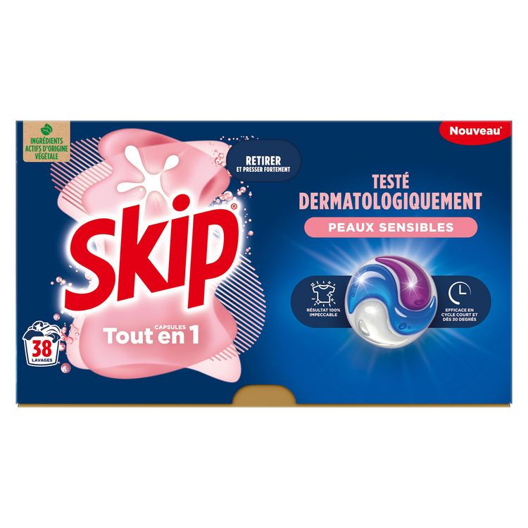 Les lessive capsules Skip 3-en-1 Peaux Sensibles & Bébé 38 Lavages respectent les peaux sensibles et vous garantissent des résultats impeccables, même en cycle court et à froid.