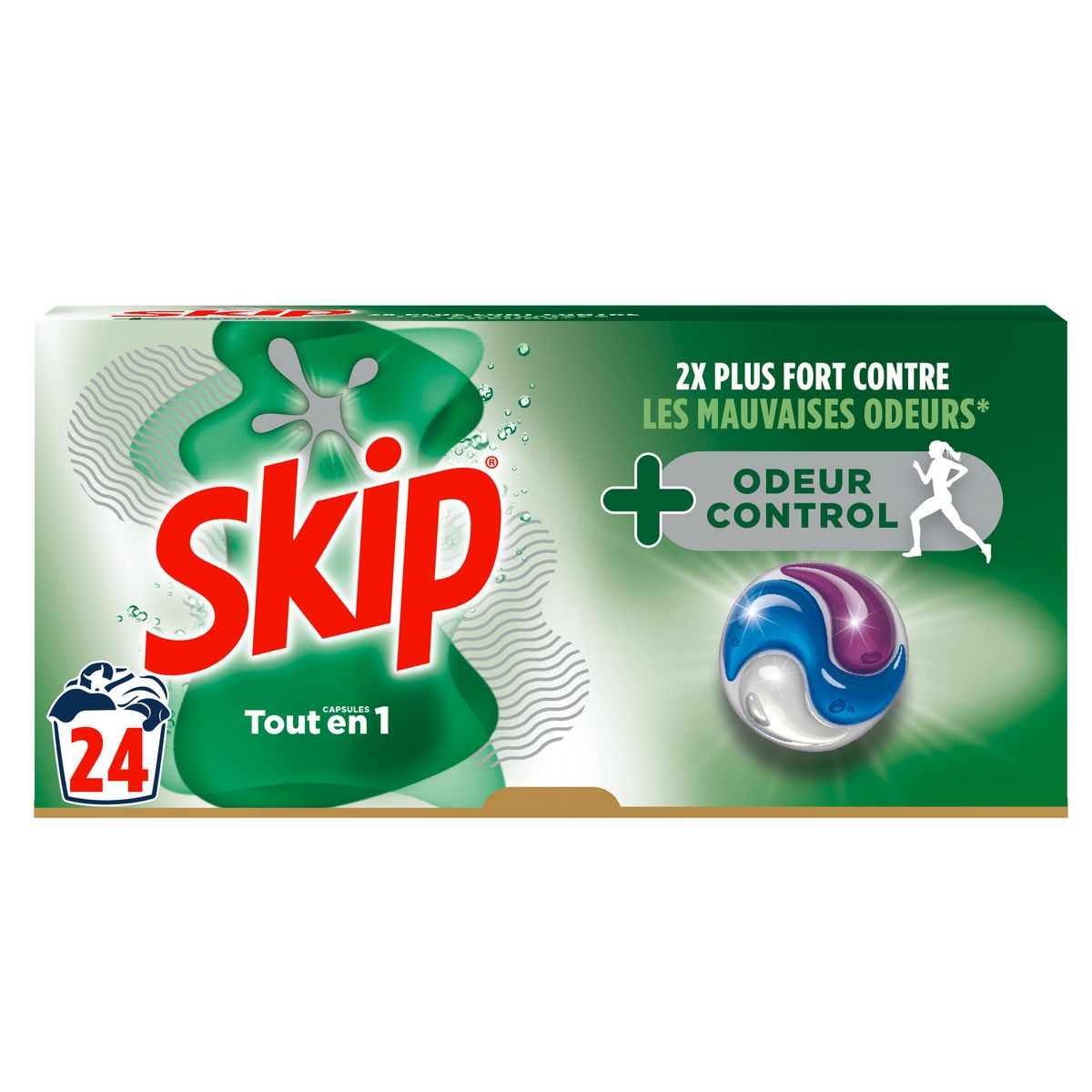 La lessive capsules Skip Tout-en-1 Odeur Control 24 lavages est 2x plus forte contre les mauvaises odeurs* et vous garantit un résultat impeccable, même en cycle court et à froid.