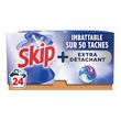 Les lessive capsules Skip Tout en 1 Extra Détachant 24 lavages sont imbattables sur 50 taches* et vous garantissent un résultat 100 % impeccable, même en cycle court et à froid.