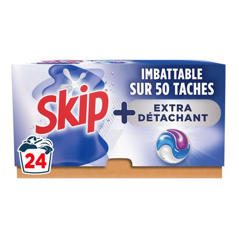 Les lessive capsules Skip Tout en 1 Extra Détachant 24 Lavages est imbattable sur 50 taches* et efficace en cycle court et à froid pour vous garantir un résultat 100 % impeccable. La technologie multicompartiment de la lessive en capsules Skip désincruste les taches les plus tenaces comme la sauce tomate, le chocolat, le thé, l'huile, les fruits rouges ou encore l'herbe. Cette lessive liquide en capsule est imbattable sur 50 taches grâce à son pouvoir extra détachant. Conçue avec des ingrédients actifs d'origine végétale, cette lessive en capsule Skip possède une membrane spécialement créée pour se dissoudre à une vitesse inégalée. Elle permet une efficacité maximale même en cycle court et à basse température, tout en ne laissant aucun résidu sur le linge. Ainsi, la capsule Skip permet de réaliser des économies d'énergie pour vous, et pour l'environnement ! Toute l'efficacité de la lessive Skip, maintenant dans un emballage en carton sans plastique et entièrement recyclable. Une capsule suffit pour nettoyer le linge en profondeur et laisser une odeur délicate, fraîche et durable. Placez une lessive capsule au fond du tambour vide avant de déposer votre linge dans le tambour. Utilisez deux capsules pour du linge très sale, de l'eau dure ou une machine de 6 à 8 kg. Skip, ce sont plus de 60 ans d'expertise et d'innovations dans le domaine des lessives, toujours guidées par une volonté d'améliorer le quotidien des familles. Skip, c'est aussi une philosophie de marque unique ! Chez Skip, nous sommes convaincus que nos enfants ont besoin d'expérimenter, de jouer dehors et de découvrir le monde qui les entoure en toute sérénité, afin de se préparer à demain. Ainsi, chaque tache peut être synonyme d'un moment de joie et de partage, d'un challenge réussi ou d'une nouvelle aventure. Pour nous, la saleté des vêtements est la marque de l'action. C'est pourquoi nos lessives sont efficaces sur les taches, même les plus tenaces. Avec Skip, la saleté, c'est bien et ça le sera toujours. Skip s'engage à prendre soin de votre linge à l'épreuve de la vie et du quotidien !
