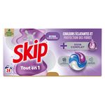 La nouvelle lessive capsules Skip Tout en 1 Soin Complet 24 Lavages, préserve l'éclat de vos couleurs tout en protégeant les fibres. Elle vous garantit un résultat impeccable !