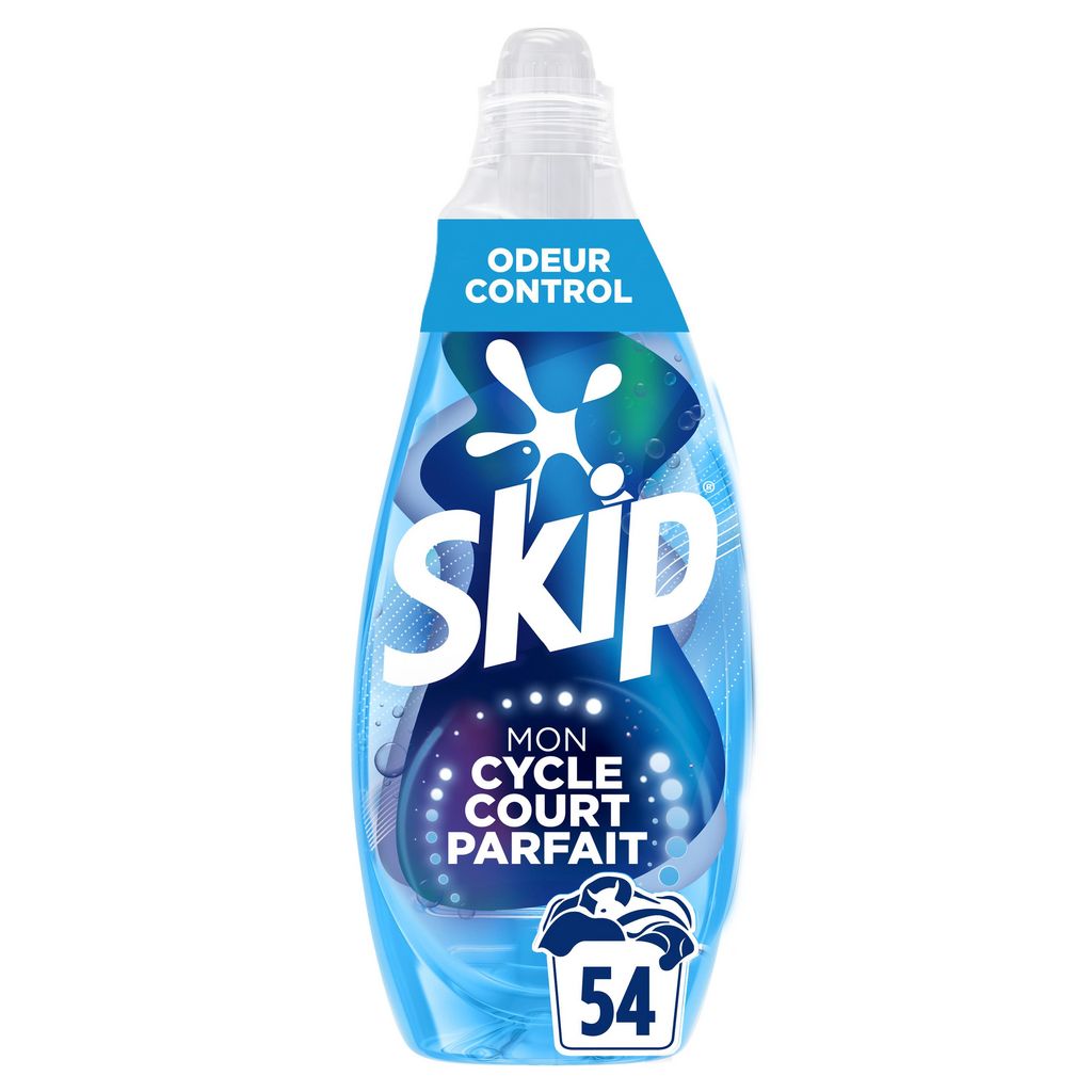 Découvrez SKIP Mon Cycle Court Parfait, la première lessive spécialement conçue pour les cycles courts. Elle délivre une efficacité optimale, même dès 15 minutes et un gain de temps, sans compromis sur la propreté de votre linge. Grâce à son action deux fois plus puissante contre les odeurs tenaces* et à ses 5 agents anti-odeurs, la lessive liquide SKIP Cycle Court Odeur Control 54 Lavages élimine efficacement les mauvaises odeurs comme la transpiration, l'humidité ou encore les odeurs de cuisine. Sa formule innovante dotée de la technologie Pro-S™ permet une dissolution très rapide et libère ainsi ses actifs dès les 15 premières minutes du cycle de votre machine à laver. Économisez de l'électricité et de l'eau en utilisant Skip Mon Cycle Court Parfait lors du programme cycle court de votre machine à laver. Pour un résultat optimal en cycle court, même dès 15 minutes, le dosage recommandé est de 40 ml pour moins de 2 kg de linge (eau douce ou moyennement dure). Ajouter 10 ml si l'eau est dure. Pour un cycle standard, le dosage recommandé est de 40 ml pour 4-5 kg de linge (eau douce ou moyennement dure). Ajouter 10 ml si l'eau est dure. *2 fois plus de parfum vs SKIP Liquide Extra Détachant.