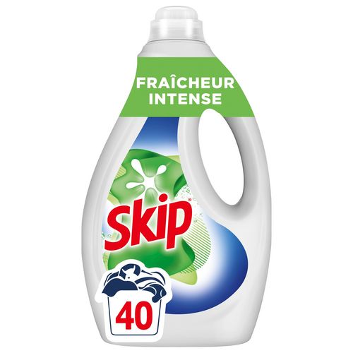 La lessive liquide Skip Fraîcheur Intense 40 lavages offre un parfum frais et durable à vos vêtements et votre linge de maison. Grâce à une formule enrichie en enzymes, elle garantit un résultat 100% impeccable pour un linge propre, éclatant et frais pour longtemps. Sa bouteille est entièrement recyclable. La lessive liquide Skip est efficace en cycle court et dès 30 °C. Avec la lessive liquide Skip, économisez de l'énergie à chaque lavage et réduisez les émissions de CO₂. Cette lessive liquide convient aux machines à laver à dosage automatique (auto-dose). Versez une dose dans le bac à produit de votre machine. 42 ml : dosage recommandé pour une eau peu ou moyennement dure. Ajouter 15 ml de lessive pour une eau dure ou du linge très sale. Lavage à la main : diluer 35 ml dans 10 L d'eau. Prétraitement des taches : 1. Déposez une petite quantité de la lessive liquide Skip sur les taches 2. Frottez doucement 3. Lancez le cycle de lavage immédiatement. Skip, ce sont plus de 60 ans d'expertise et d'innovations dans le domaine des lessives, toujours guidées par une volonté d'améliorer le quotidien des familles. Skip, c'est aussi une philosophie de marque unique ! Chez Skip, nous sommes convaincus que nos enfants ont besoin d'expérimenter, de jouer dehors et de découvrir le monde qui les entoure en toute sérénité, afin de se préparer à demain. Ainsi, chaque tache peut être synonyme d'un moment de joie et de partage, d'un challenge réussi ou d'une nouvelle aventure. Pour nous, la saleté des vêtements est la marque de l'action. C'est pourquoi nos lessives sont efficaces sur les taches, même les plus tenaces. Avec Skip, la saleté, c'est positif et ça le sera toujours. Skip s'engage à prendre soin de votre linge à l'épreuve de la vie et du quotidien.